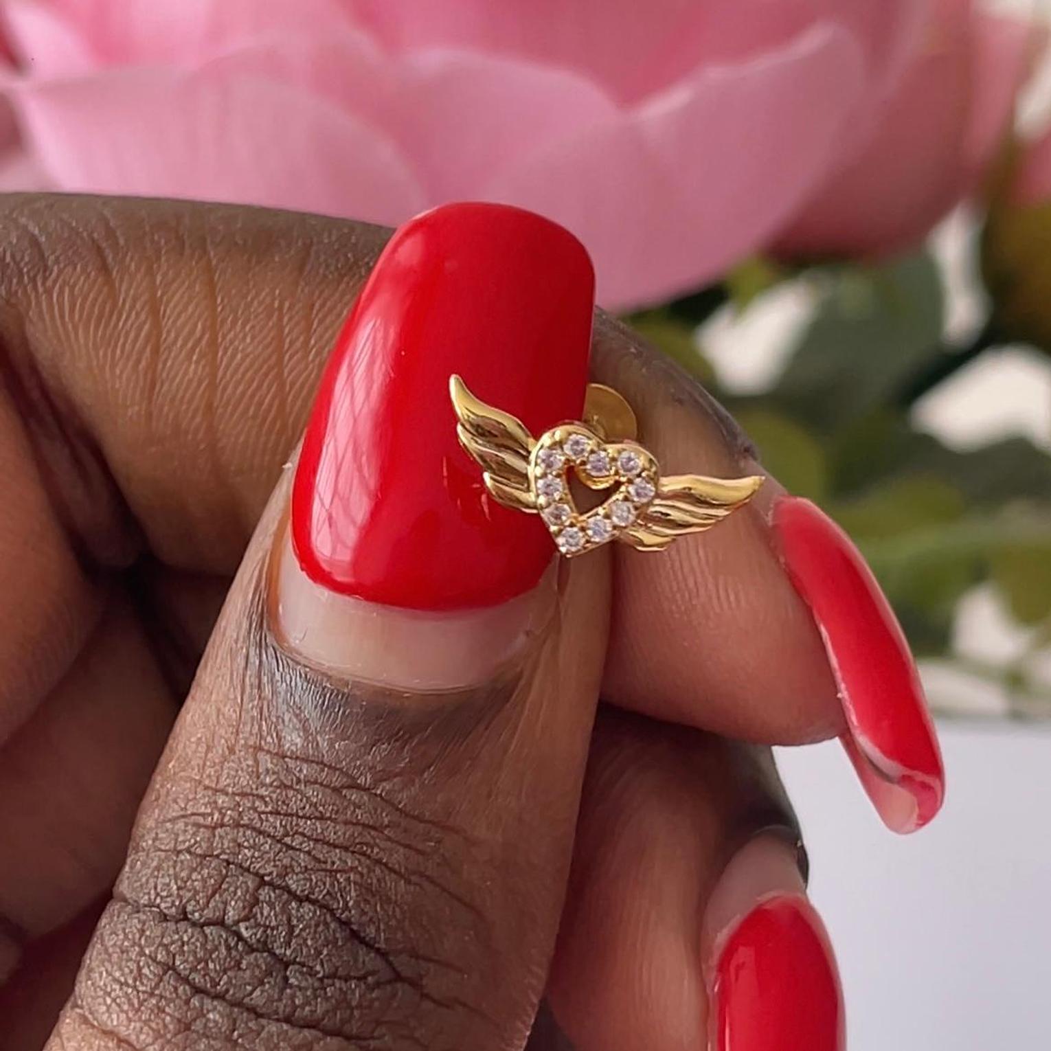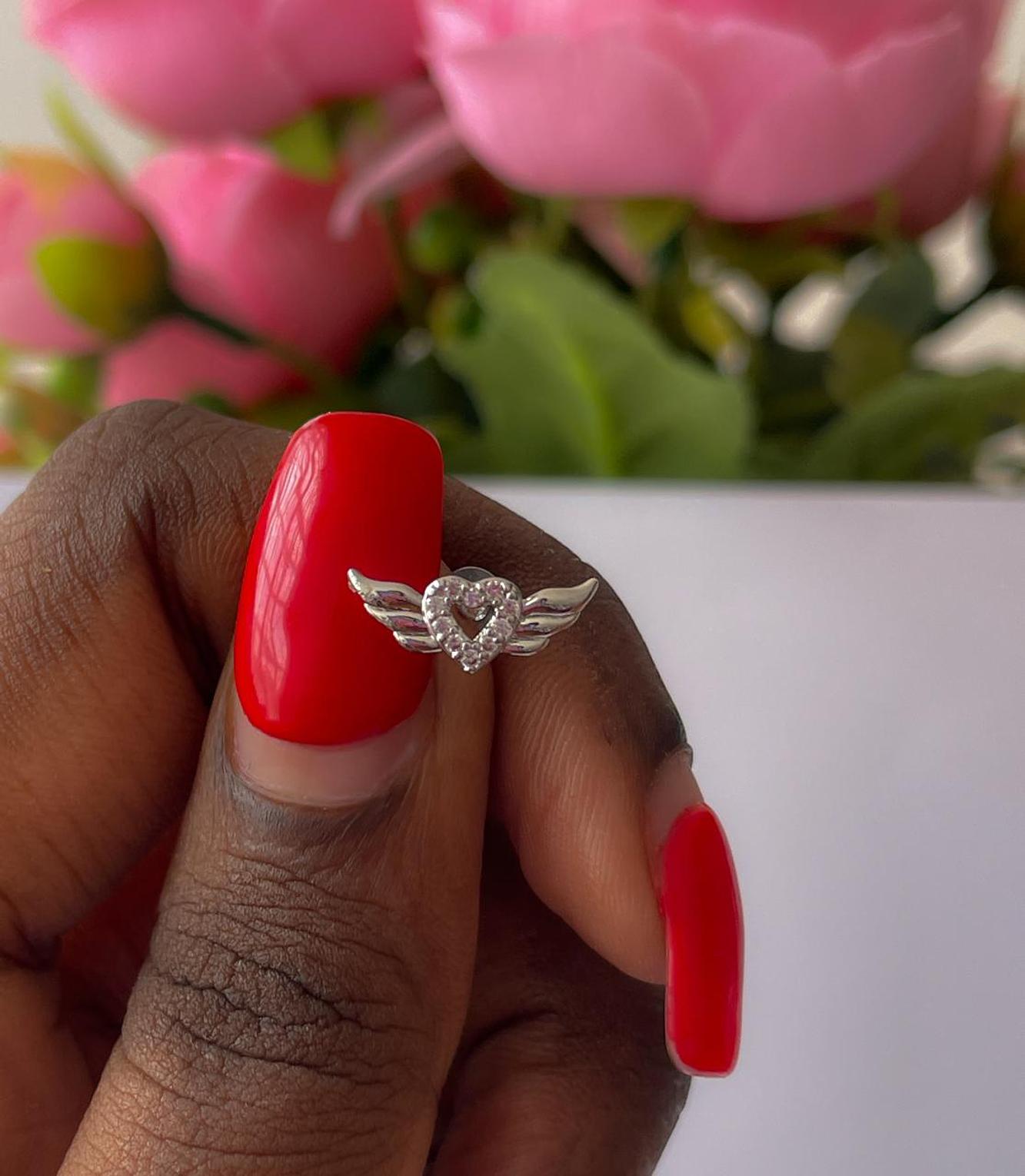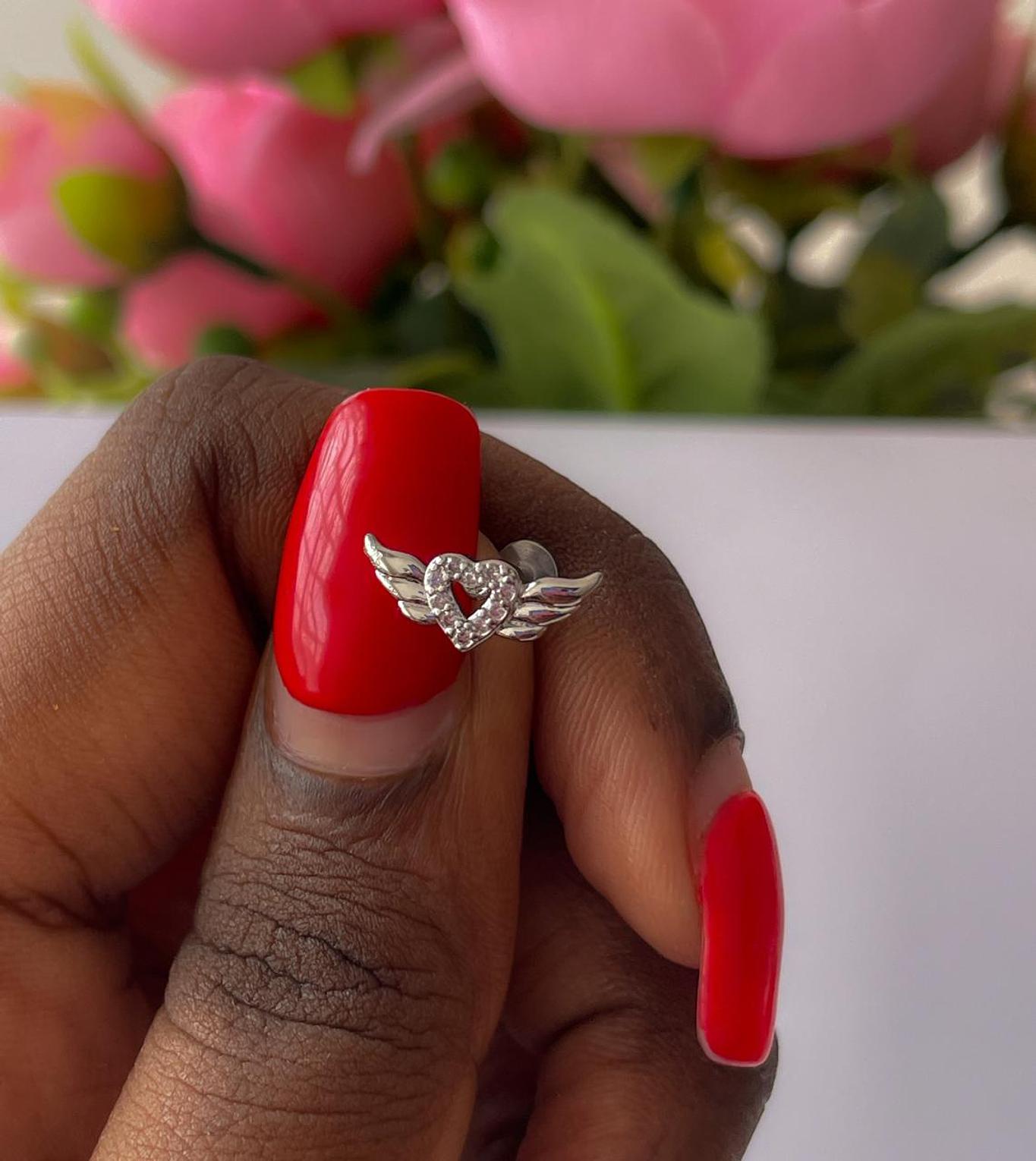 Embrace a whimsical touch with this enchanting heart and wings flat back stud, delicately adorned with sparkling details. Perfect for adding a sweet and celestial charm to your piercing.