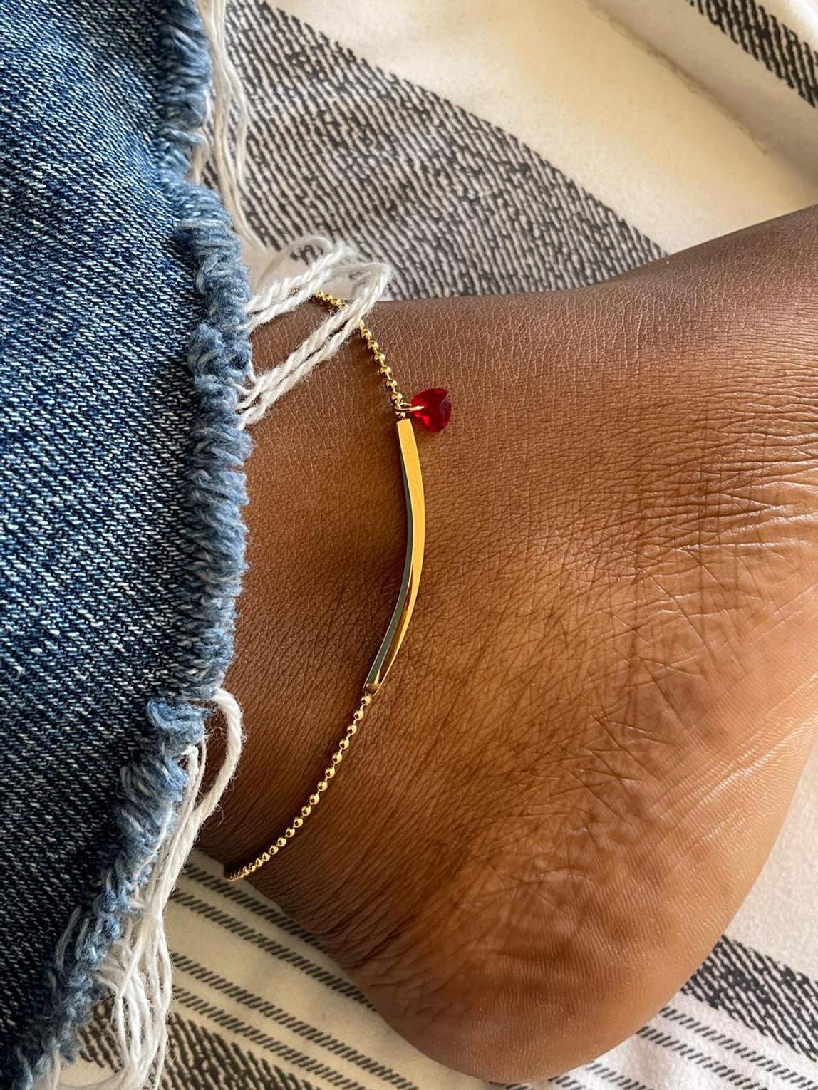This contemporary piece features a sleek, gracefully curved gold bar anchored by a vibrant, miniature crimson heart accent. The design offers a sophisticated blend of modern lines and passionate color.