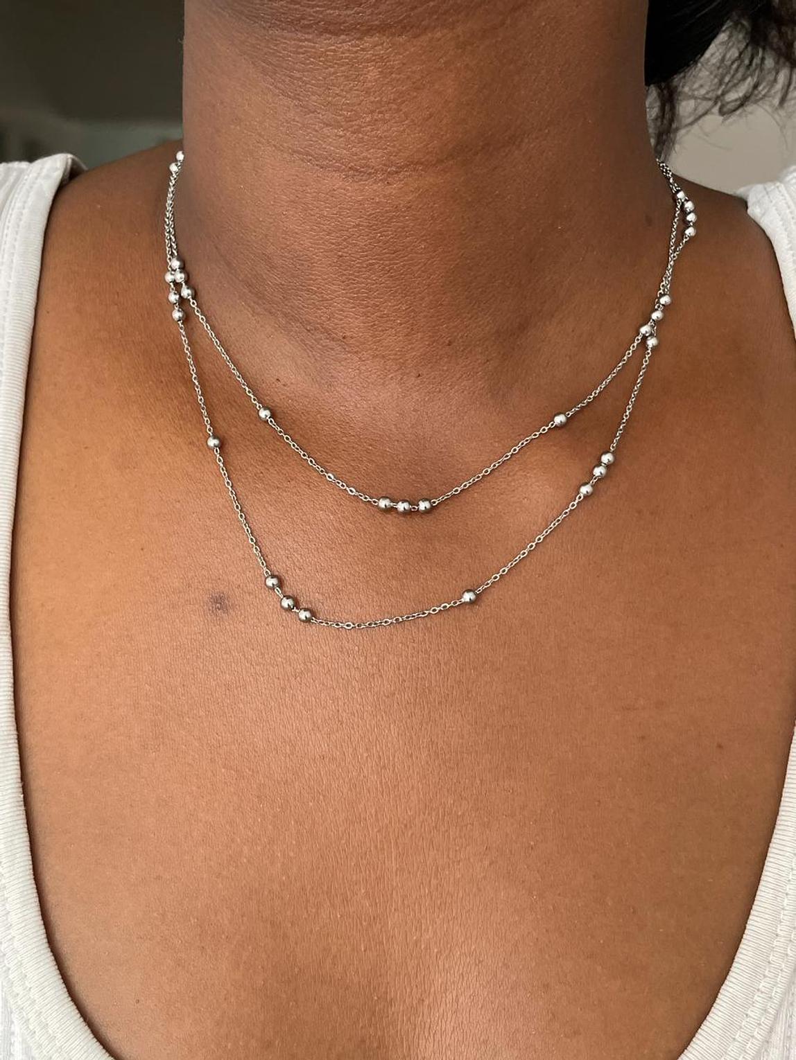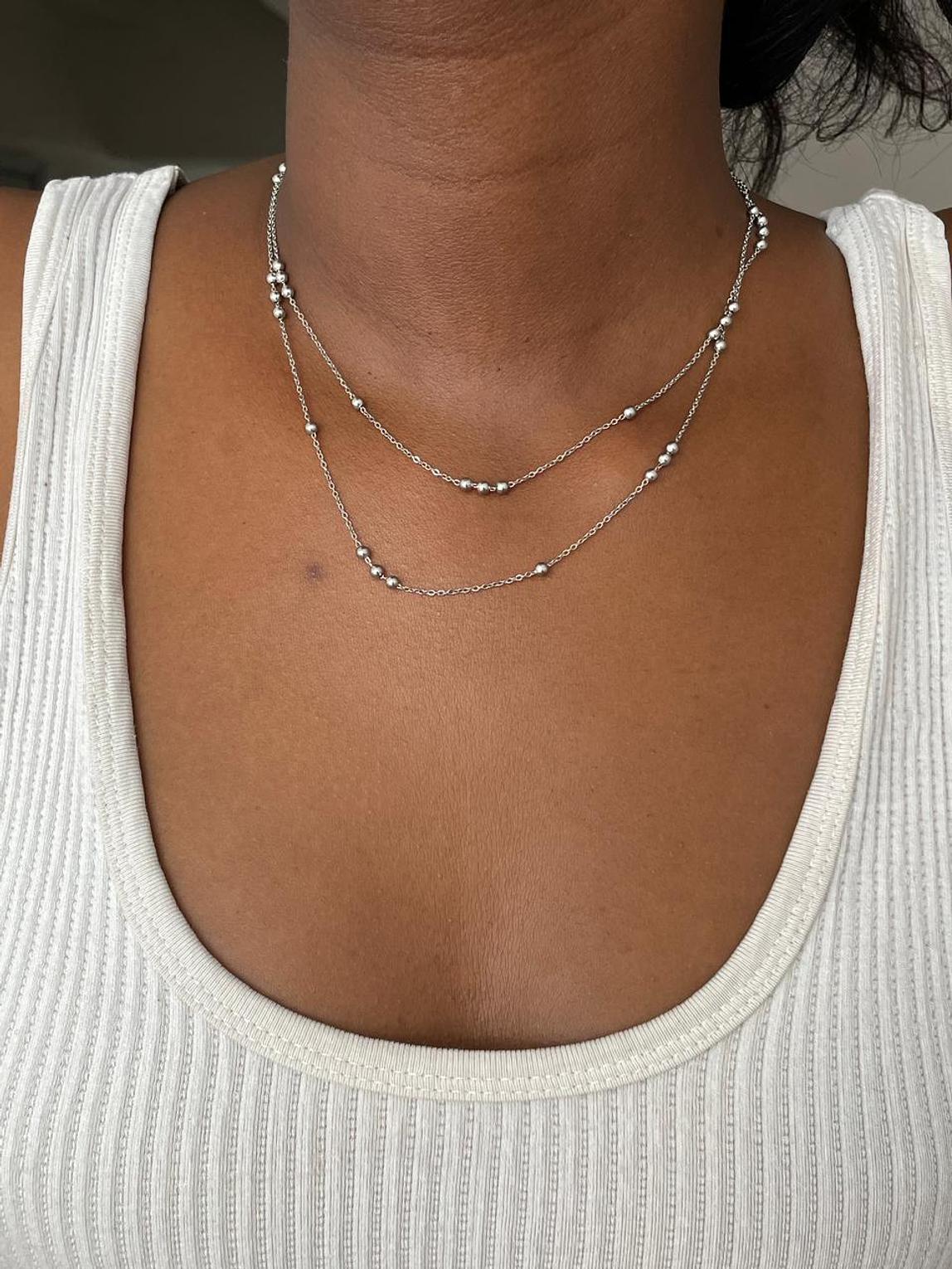 Grace your neckline with this elegant dual-layered silver-toned necklace, featuring delicate chains adorned with tiny, shimmering beads. A versatile piece that offers subtle sparkle and sophisticated charm.