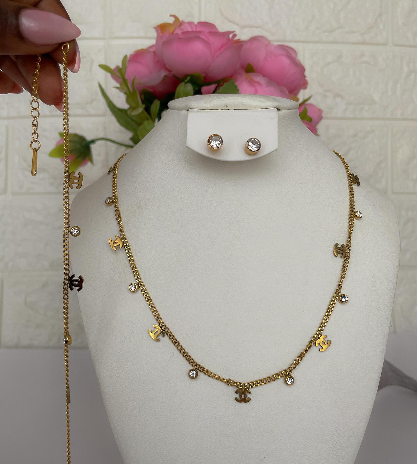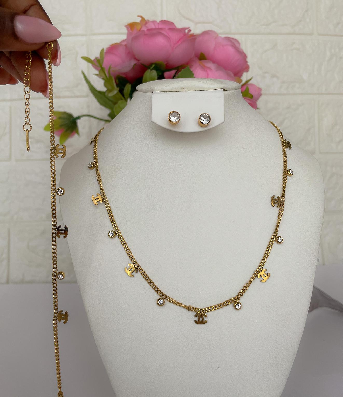 Adorn yourself with the Elegant Interlocking Charm Set, a sophisticated collection featuring iconic 'C' motifs and shimmering accents. This matching necklace, bracelet, and earring set offers a touch of designer-inspired elegance.