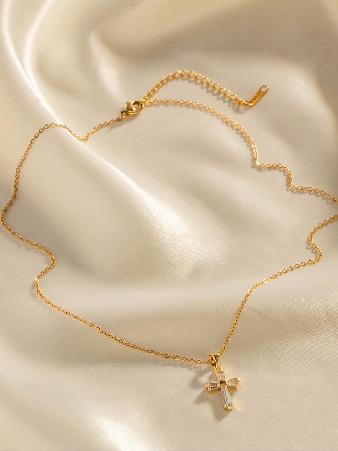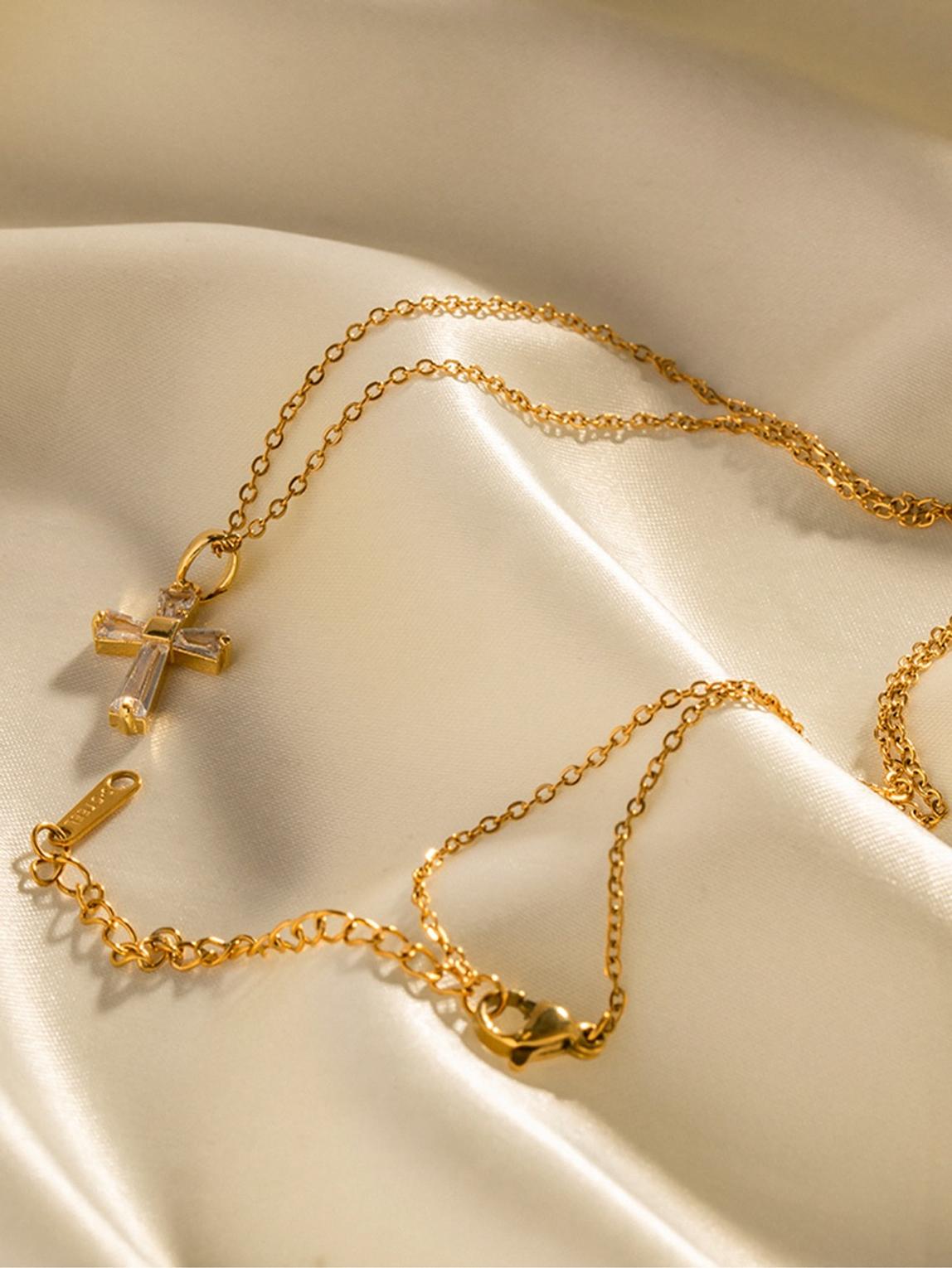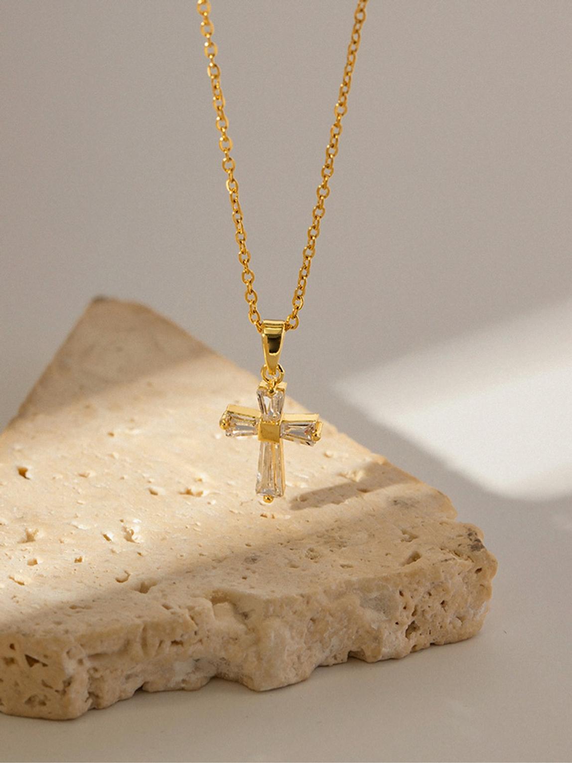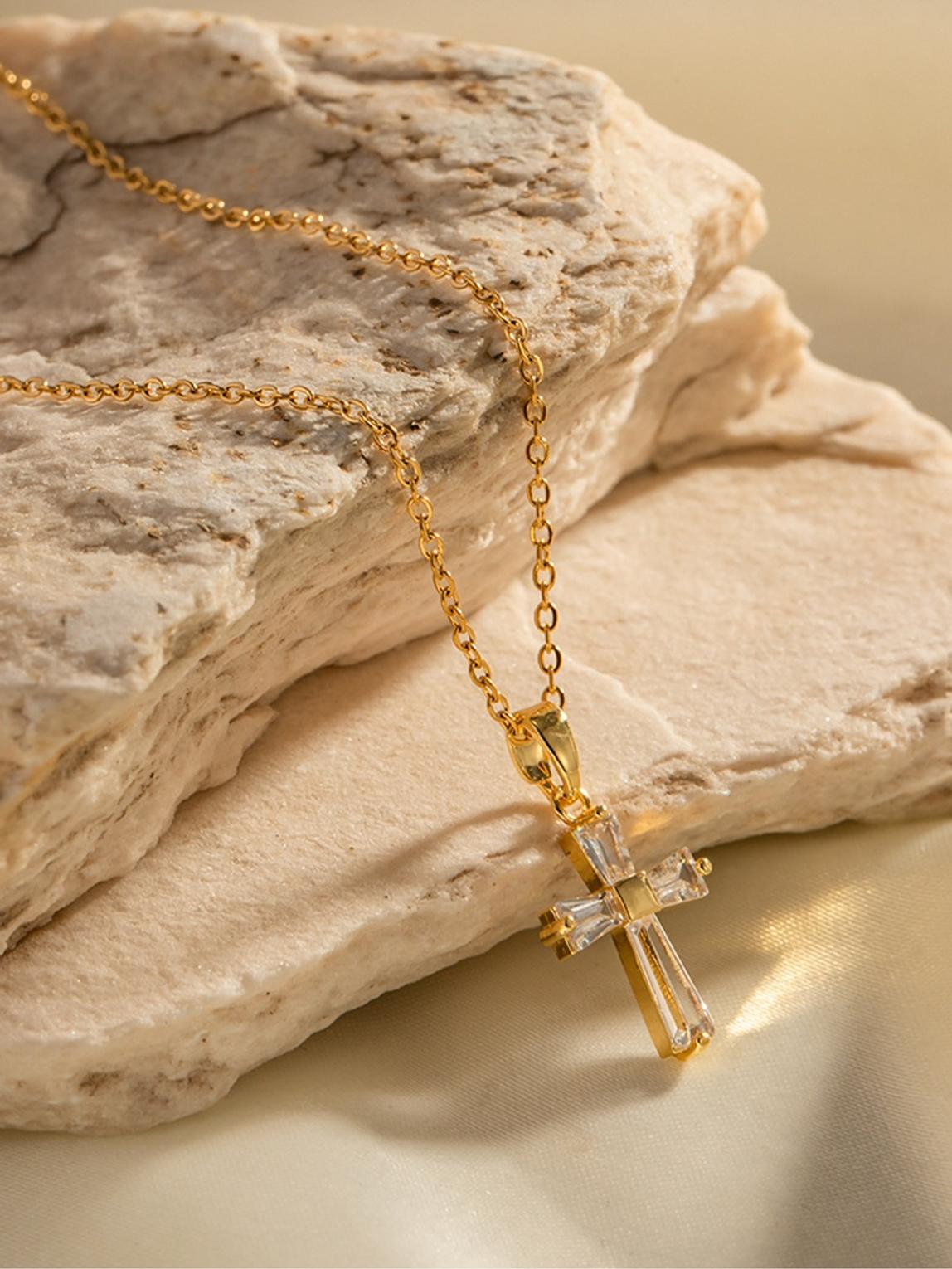 An elegant gold cross pendant adorned with sparkling rhinestones, perfect for adding a subtle touch of shine to any outfit.