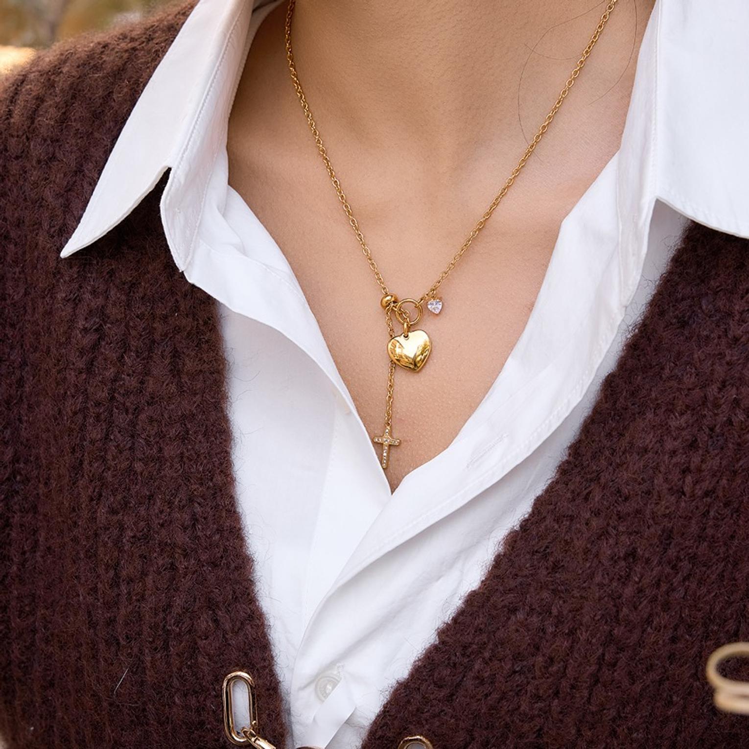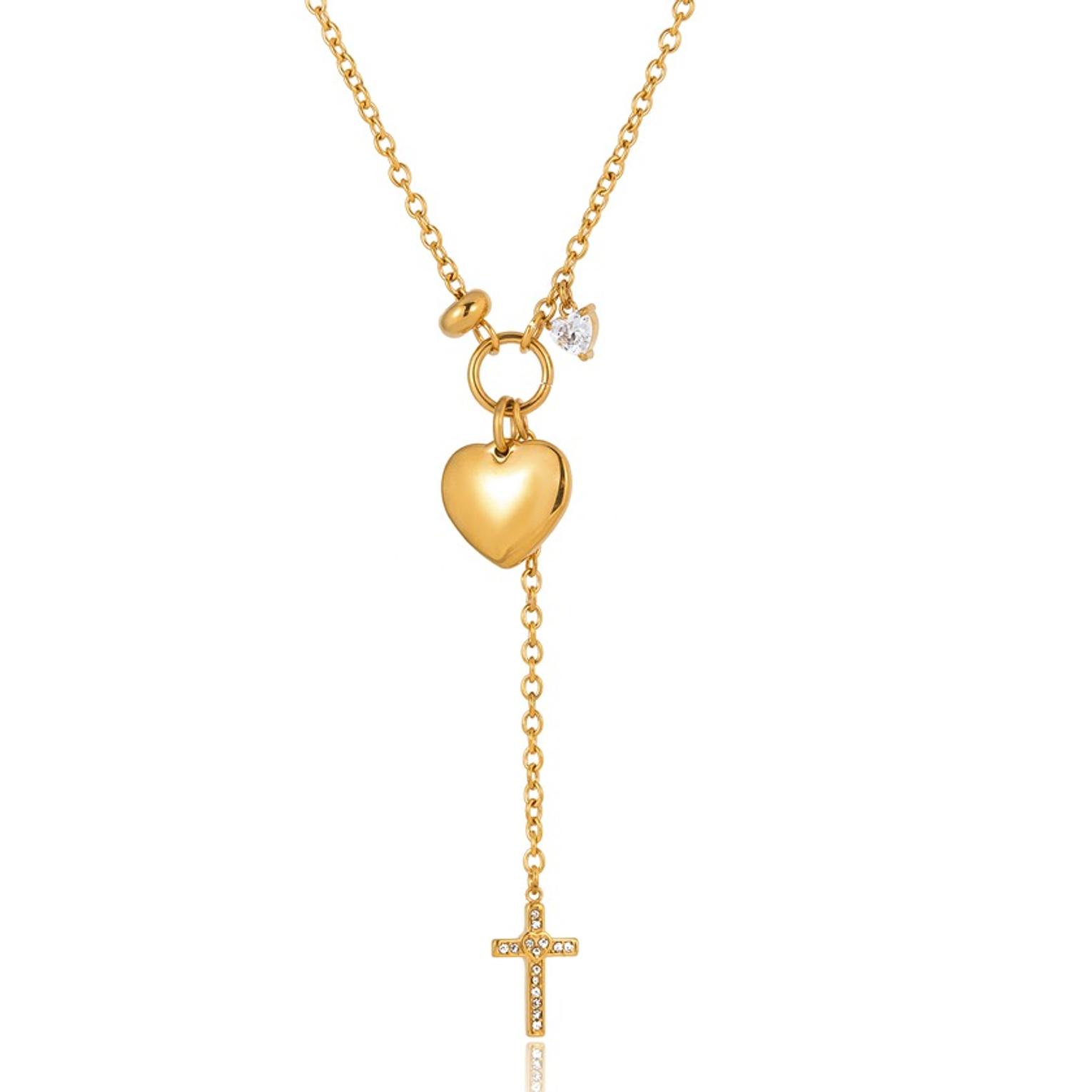 A timeless gold necklace featuring a heart, pearl, and cross — a symbol of love and faith.