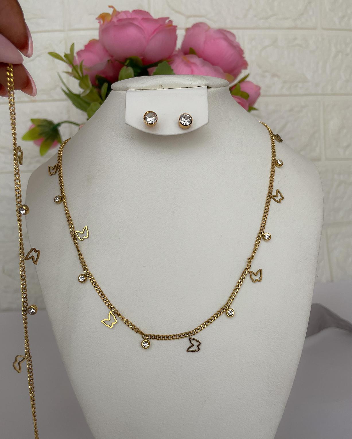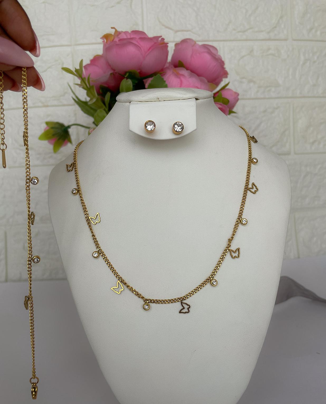 Adorn yourself with the delightful Golden Flutter & Sparkle Set, featuring graceful butterflies and shimmering accents. This charming necklace, bracelet, and earring collection offers a touch of whimsical elegance to any look.