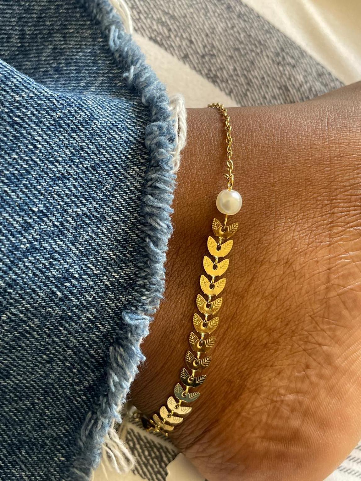 This elegant piece combines a flowing gold-plated leaf chain with a single, lustrous pearl for sophisticated contrast. It's a timeless accessory that perfectly blends natural beauty with refined polish.
