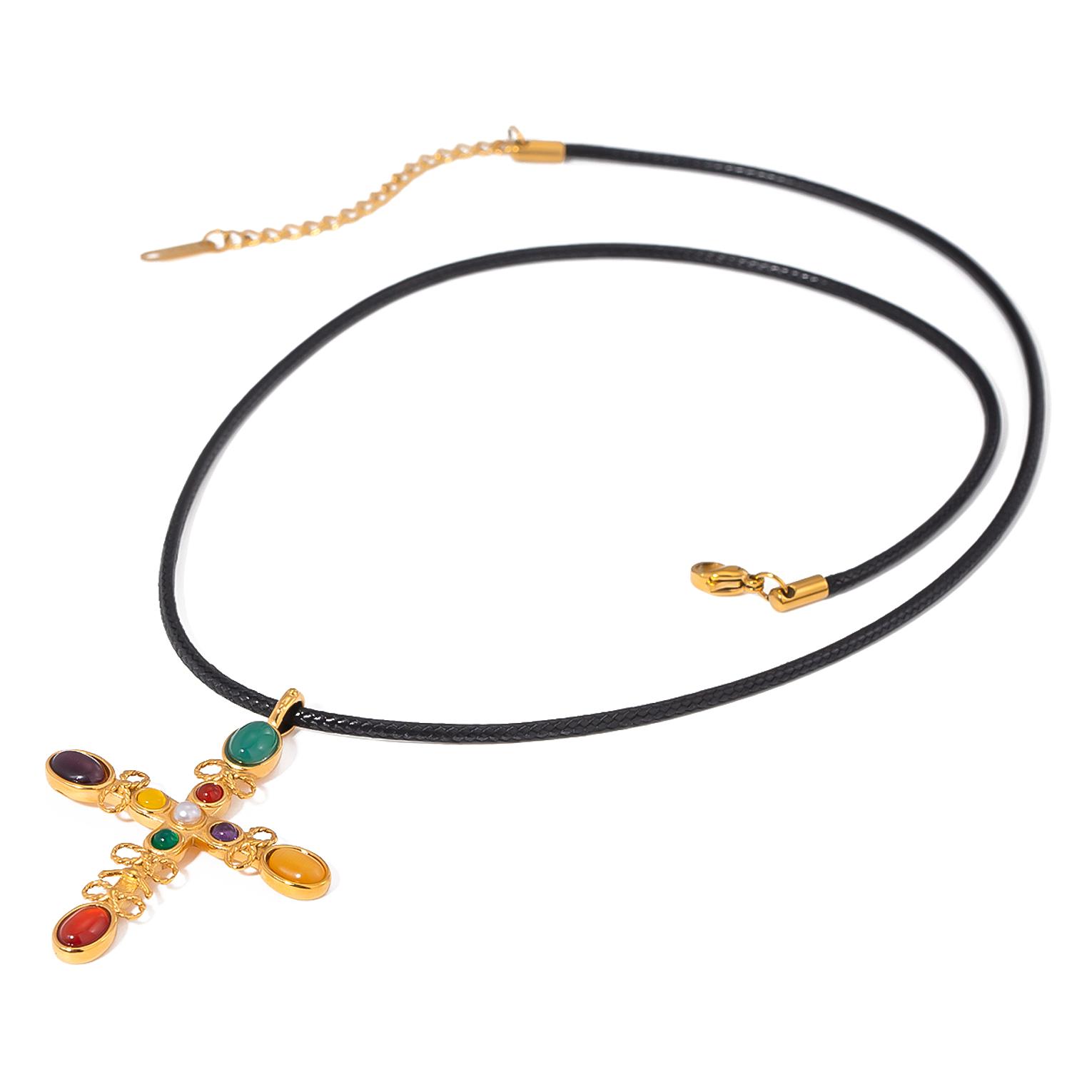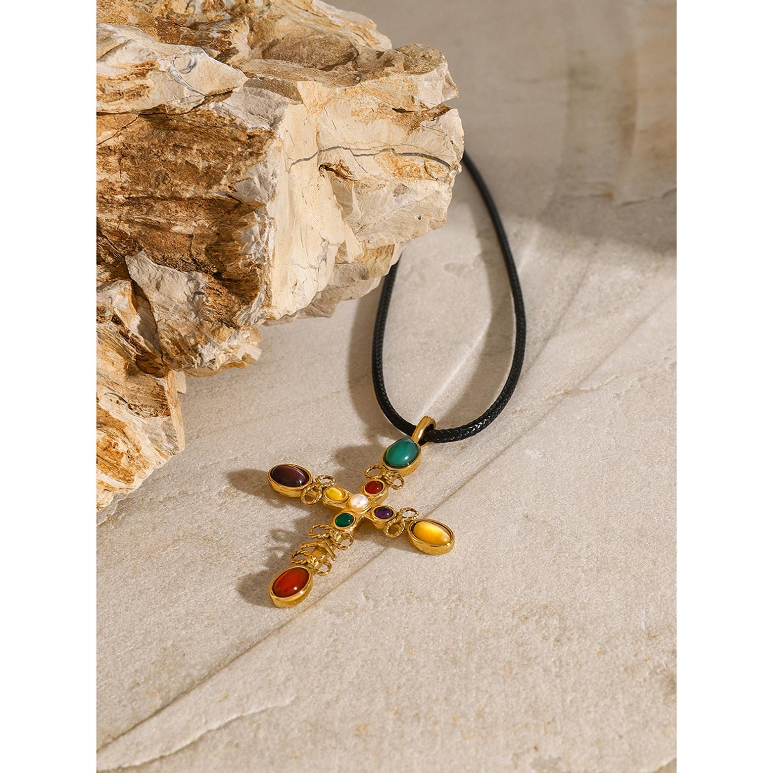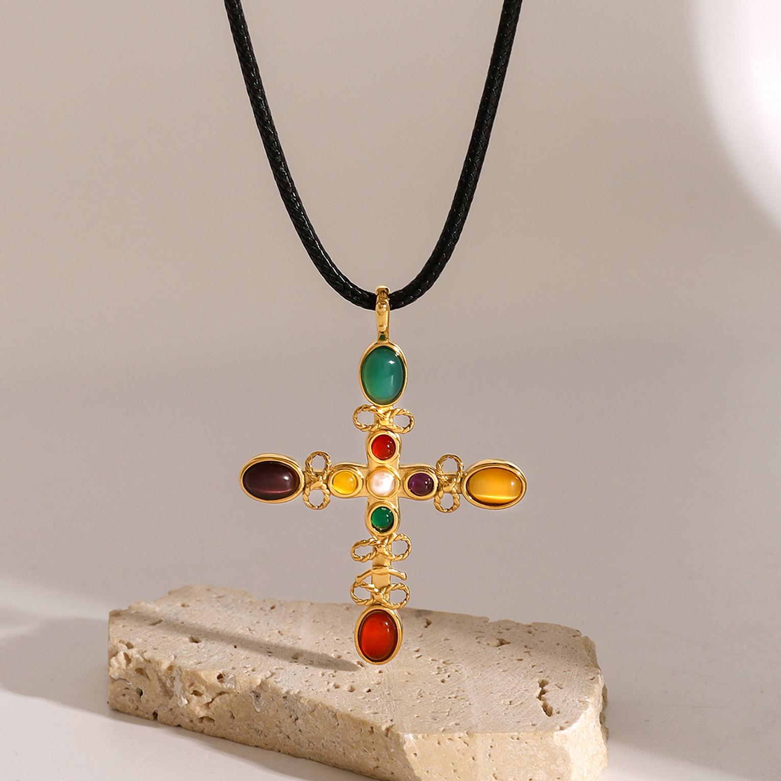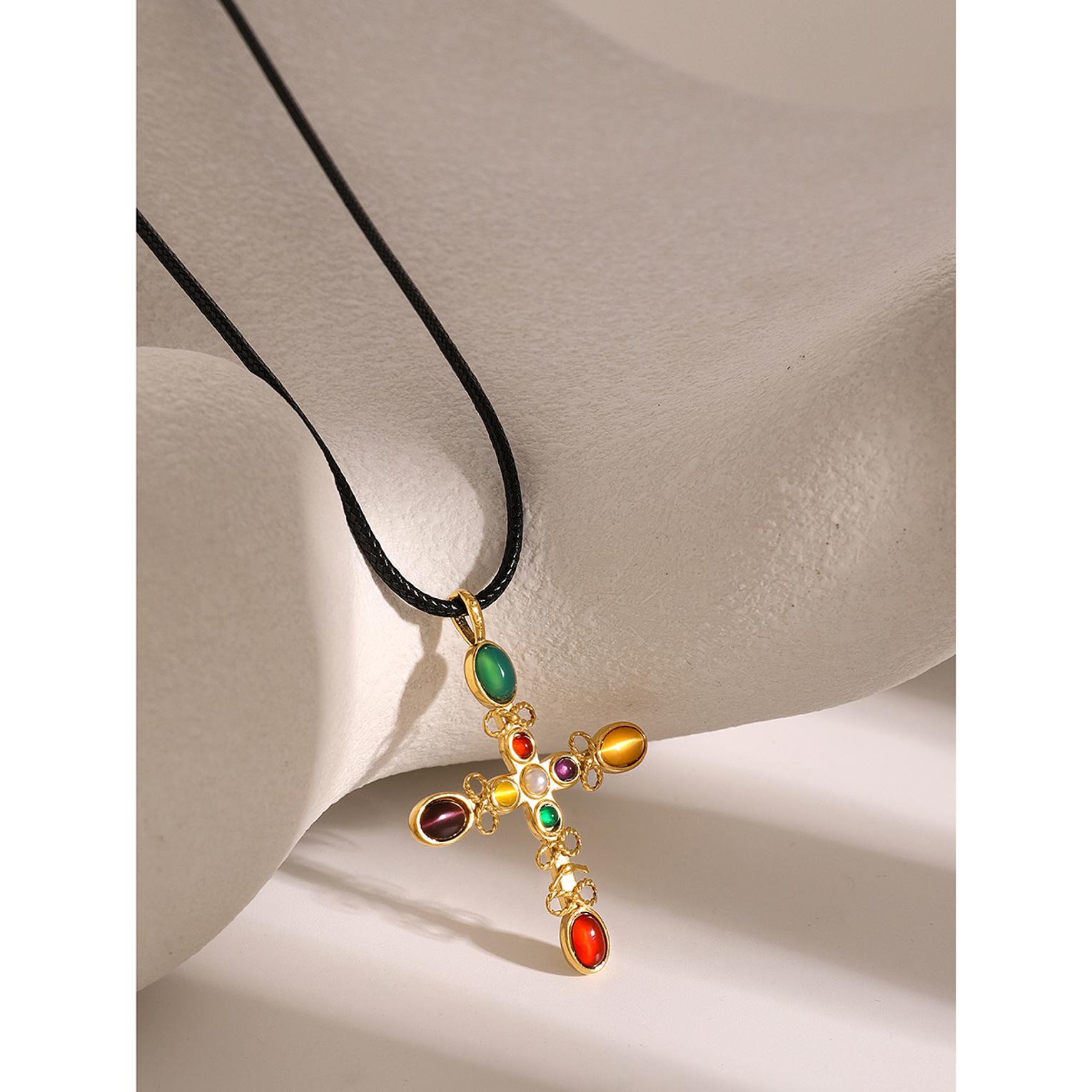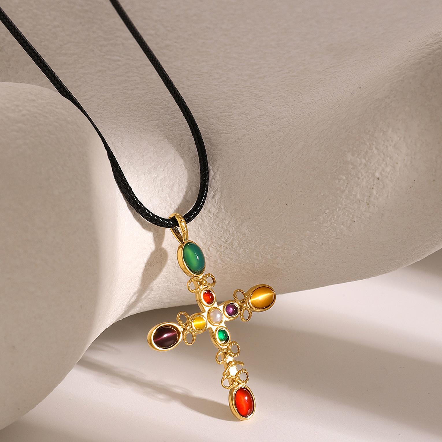 A radiant gold-toned necklace featuring a glowing cat’s eye stone cross for timeless elegance.