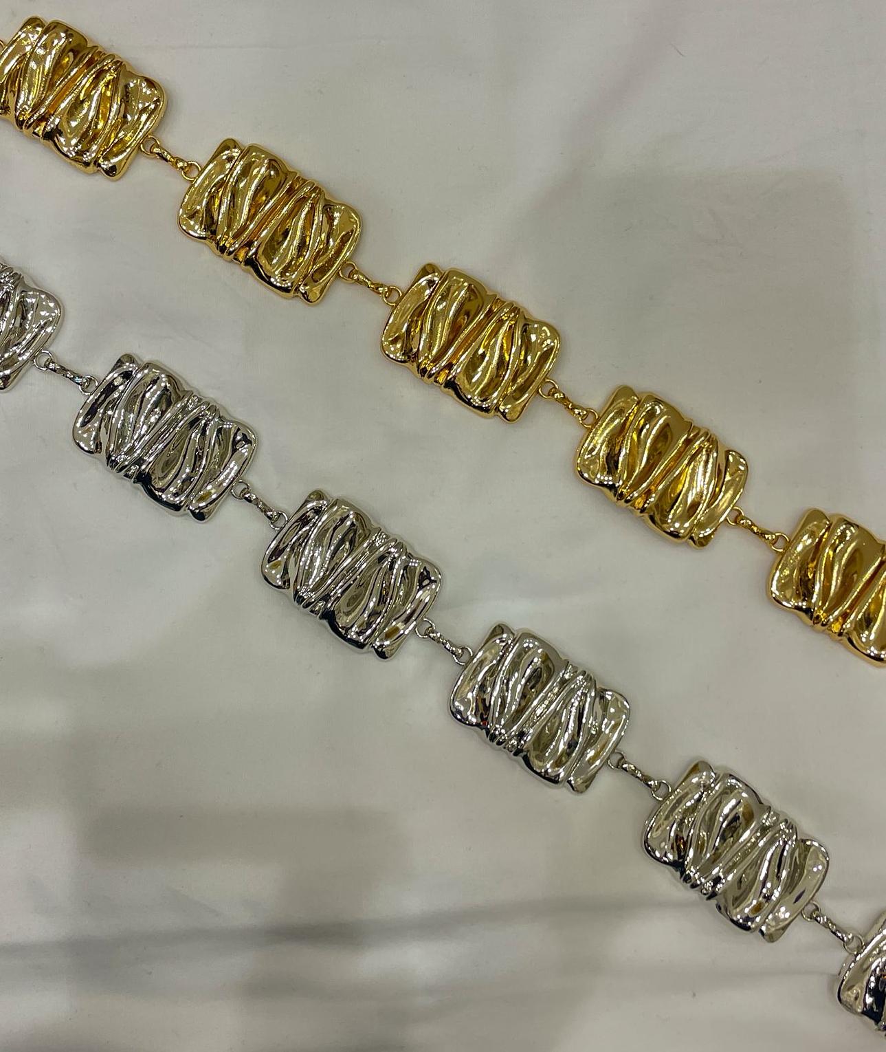 The Luxe Ribbed Chain Waist Belt elevates any ensemble with its striking geometric design featuring chunky rectangular links adorned with vertical ribbed texturing that creates captivating light reflection and visual depth. Available in lustrous gold-tone and silver-tone finishes, this statement waist belt combines modern minimalist aesthetics with luxurious metallic shine, making it ideal for defining silhouettes over dresses, blazers, oversized shirts, or cardigans. Each rectangular link measures approximately 25mm in length and features smooth connecting joints that ensure comfortable wear and flexible movement around the waist. The substantial weight and premium construction provide durability while the adjustable chain design accommodates various waist sizes and styling preferences. This versatile accessory seamlessly transitions from casual streetwear to evening elegance, making it essential for fashion-conscious women who appreciate bold metallic accents, contemporary geometric designs, and statement pieces that instantly transform basic outfits into polished, sophisticated looks.