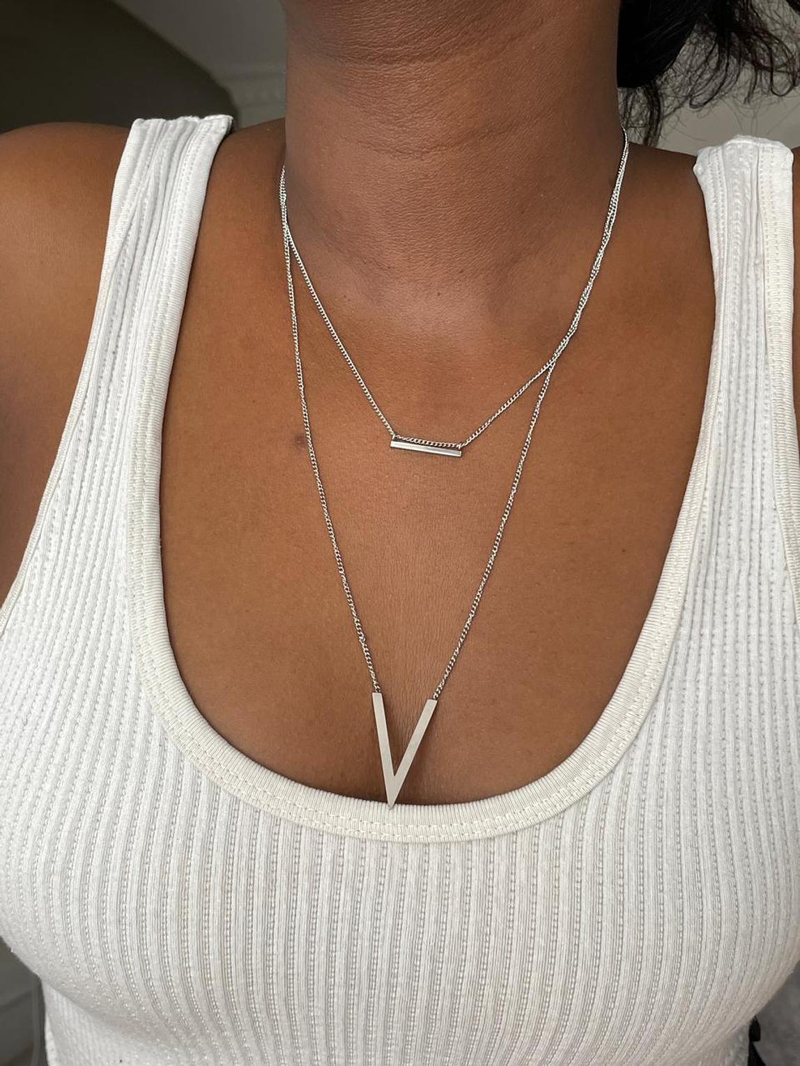 Adorn your neckline with this sleek multi-layered silver necklace, featuring a modern bar pendant and a striking V-shaped charm. This contemporary piece offers sophisticated geometry for an effortlessly chic look.