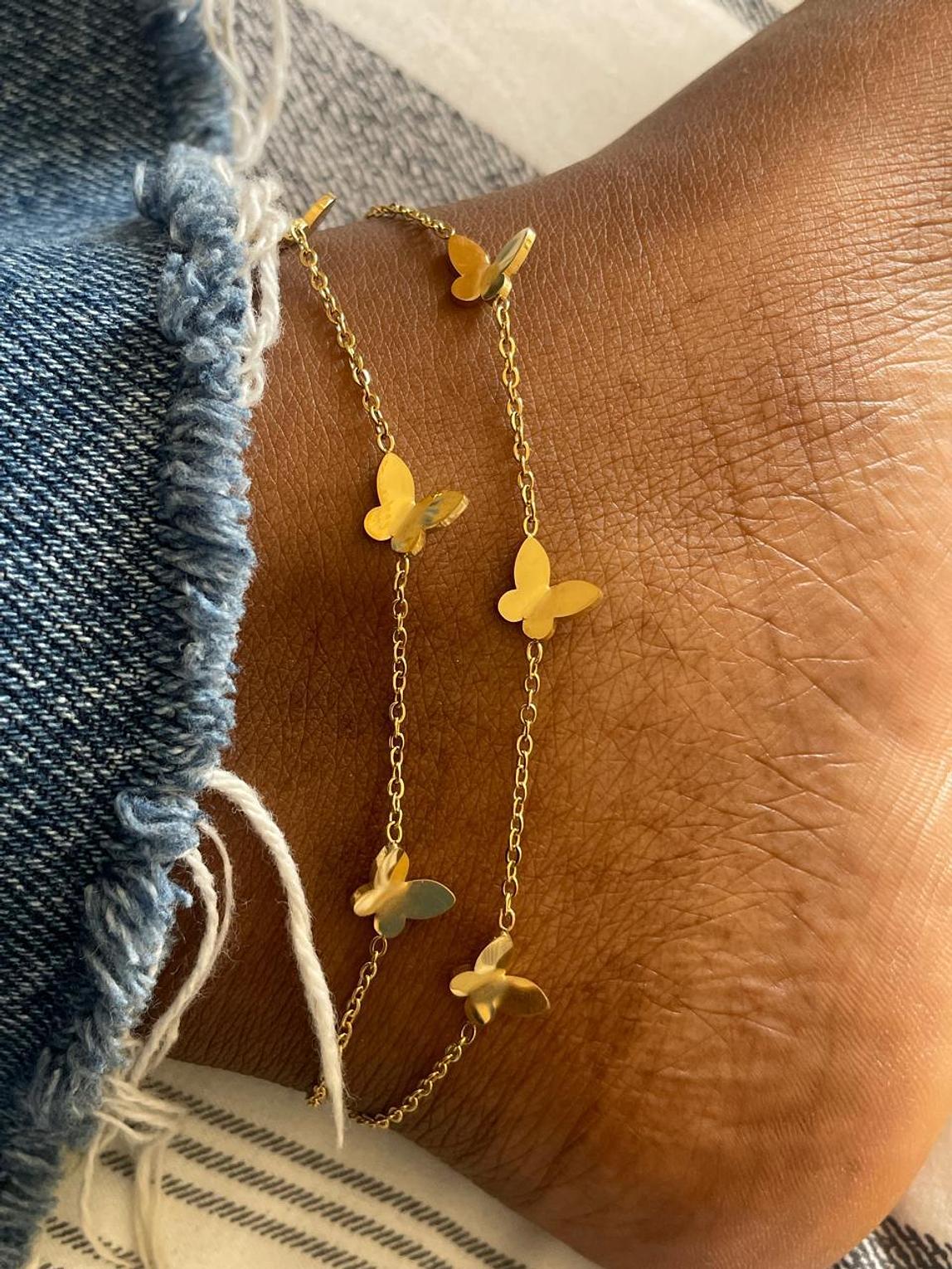 Celebrate transformation and freedom with this stunning anklet featuring delicate fluttering butterfly charms. Crafted for durability, it adds a whimsical, golden touch to your everyday style.