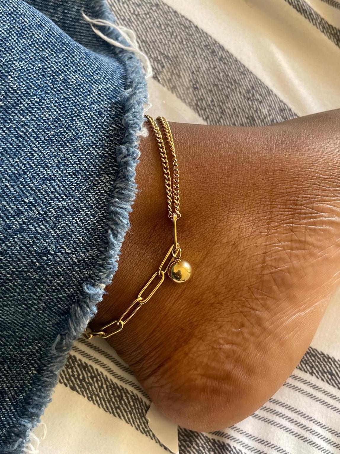 Featuring a contemporary blend of curb and paperclip chains, this dual-strand anklet makes a modern statement. The single polished gold sphere adds a captivating, weighted movement to the design.