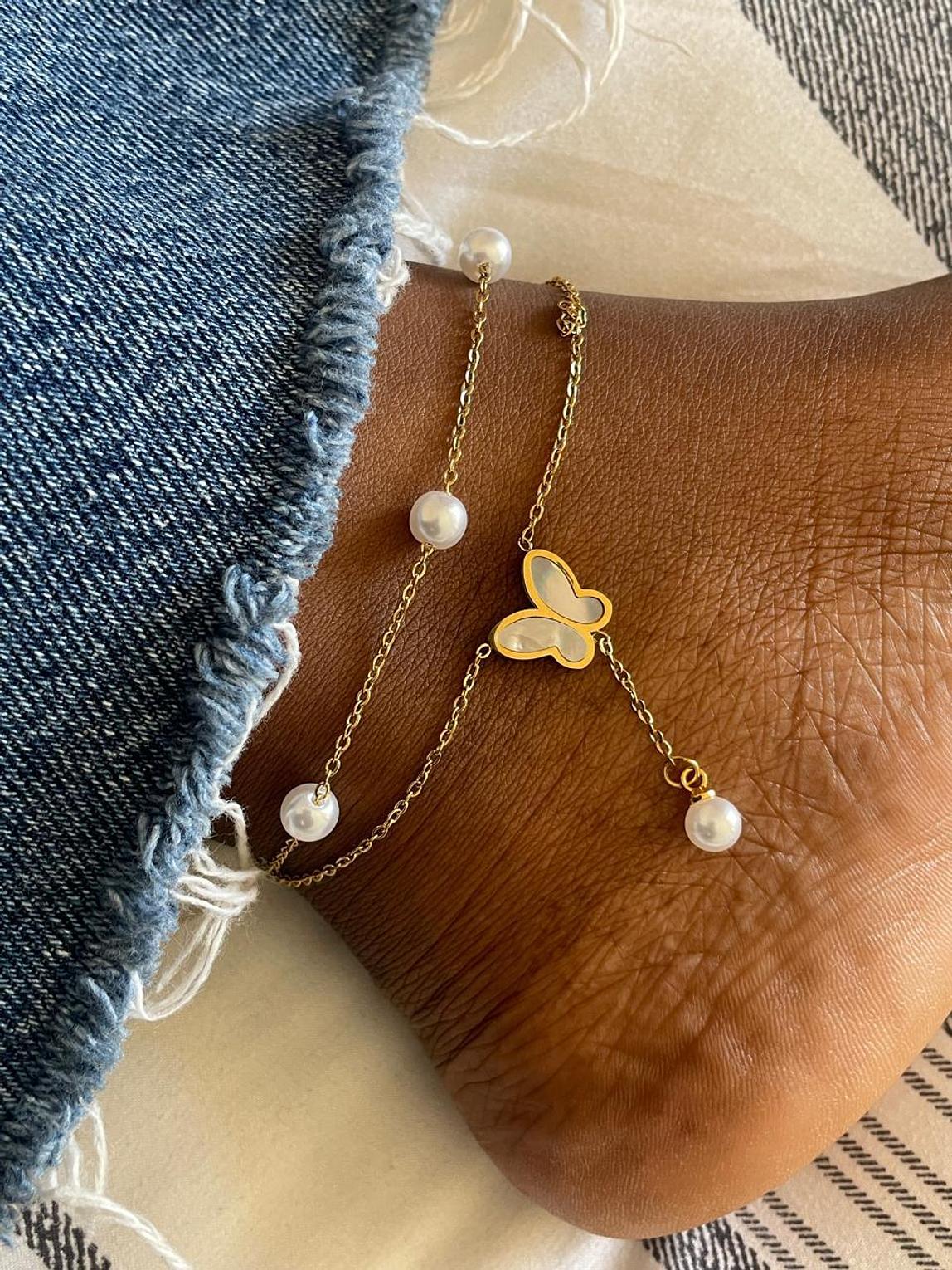 This elegant, dual-strand anklet combines the organic beauty of pearls with a shimmering, mother-of-pearl butterfly charm. It is a graceful accessory that brings delicate movement and luminosity to your step.