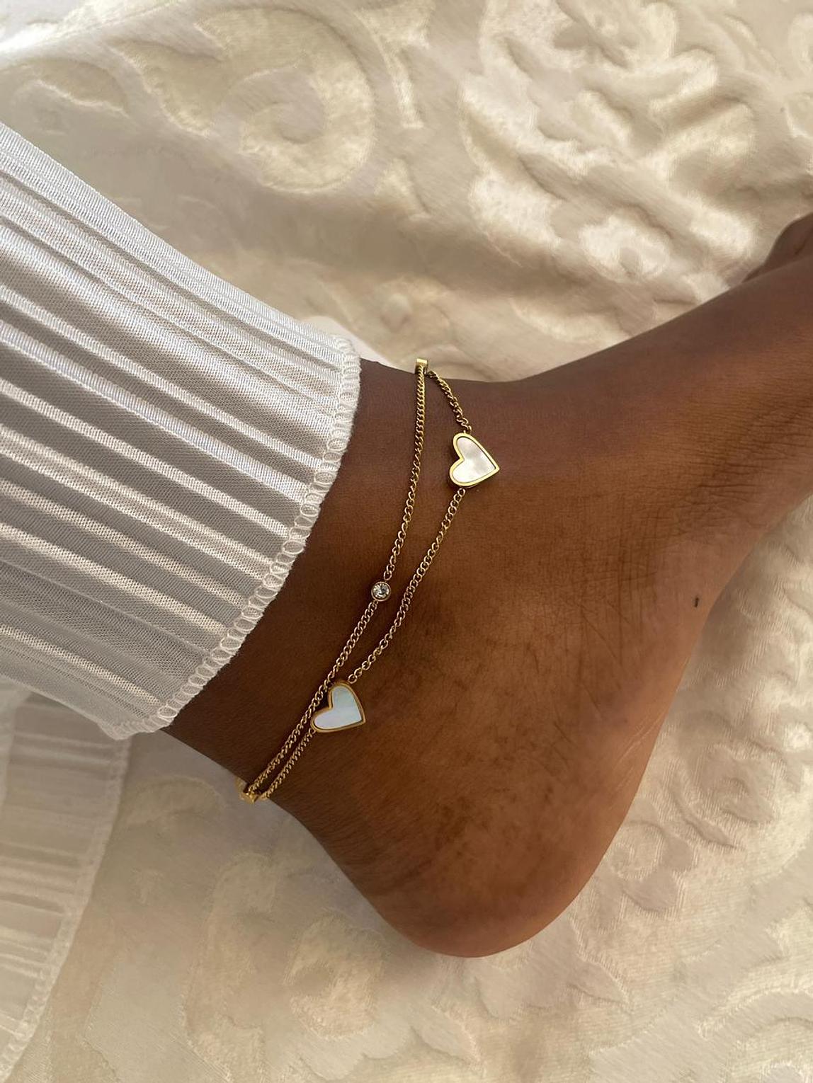 Showcasing two delicate chains with shimmering mother-of-pearl heart charms, this layered anklet captures romance and ethereal beauty. A small crystal adds a final touch of brilliant, captivating sparkle.