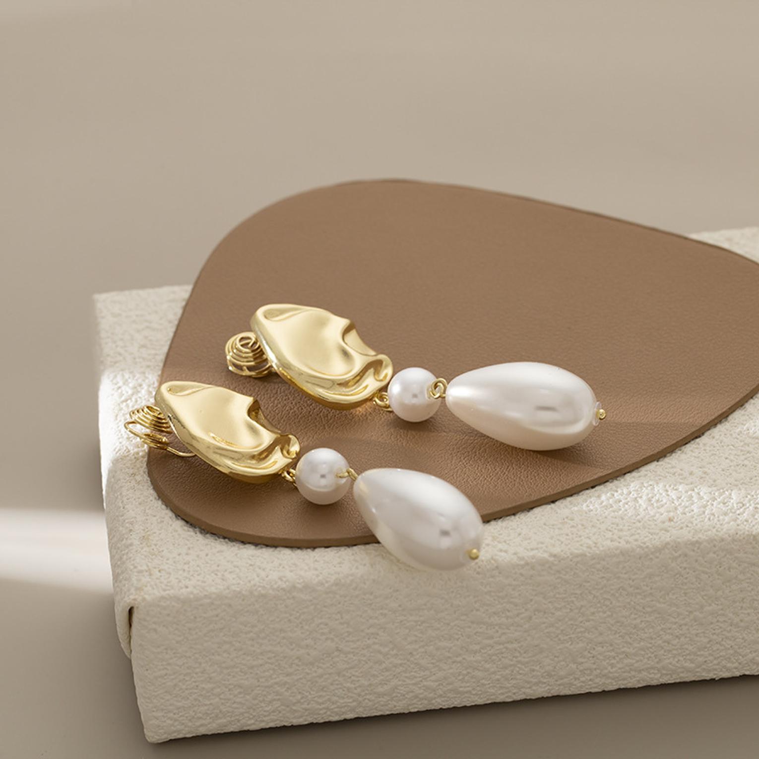 Retro geometric pearl drop ear clips with irregular mosquito coil tray design. Elegant zinc alloy fashion jewelry with no-piercing style.