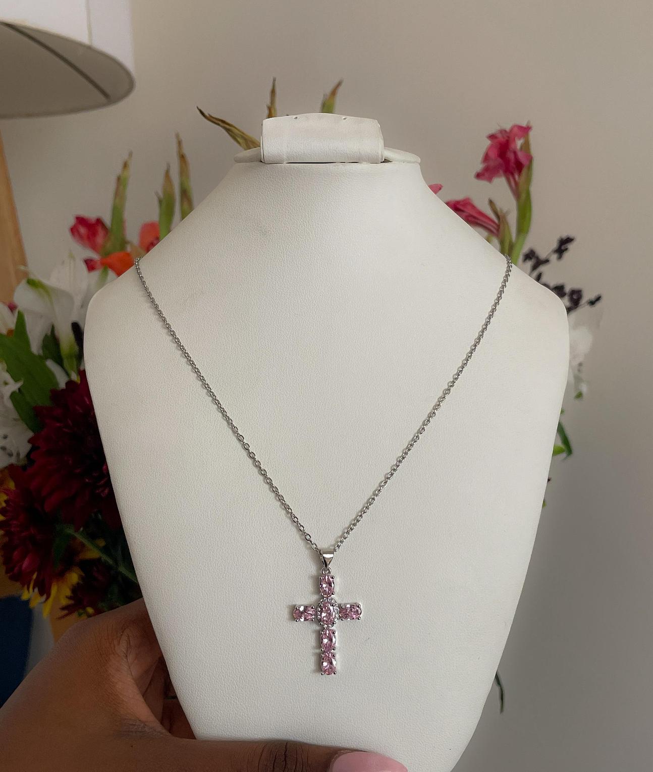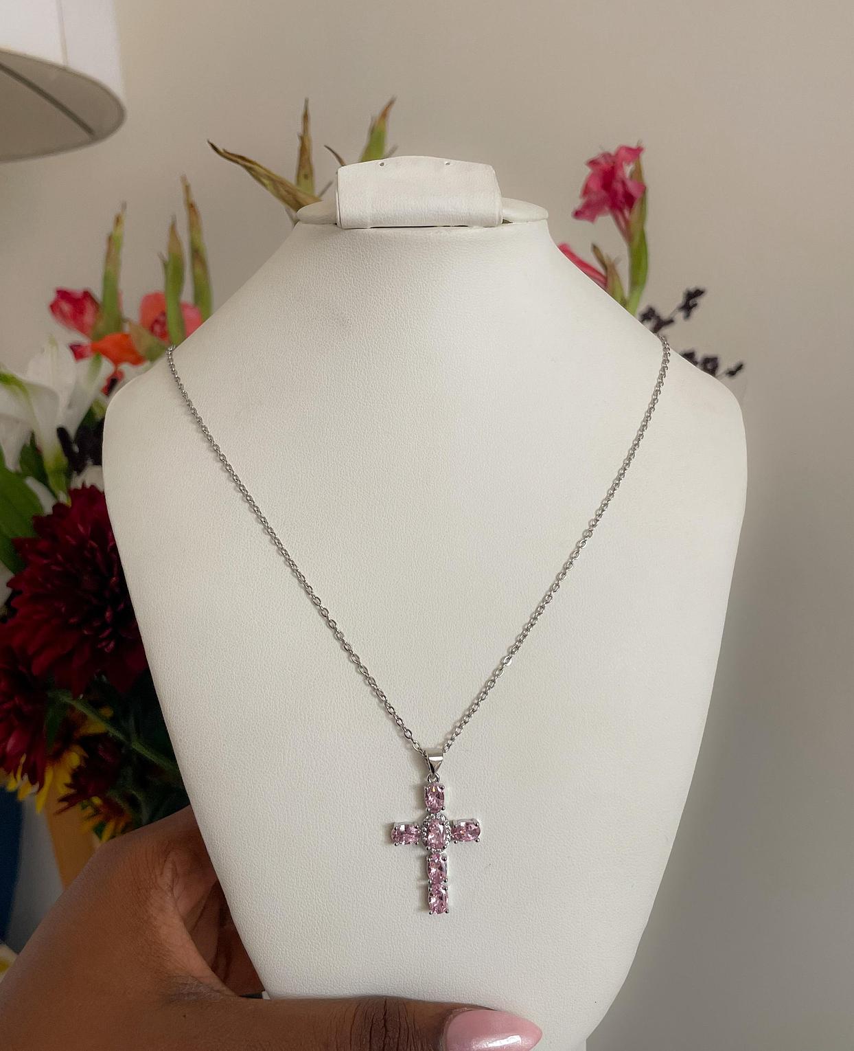 Embrace spiritual grace with a touch of soft color in the Rose Quartz Radiance Cross Necklace. This beautifully crafted and meaningful accessory offers serene elegance for any occasion.