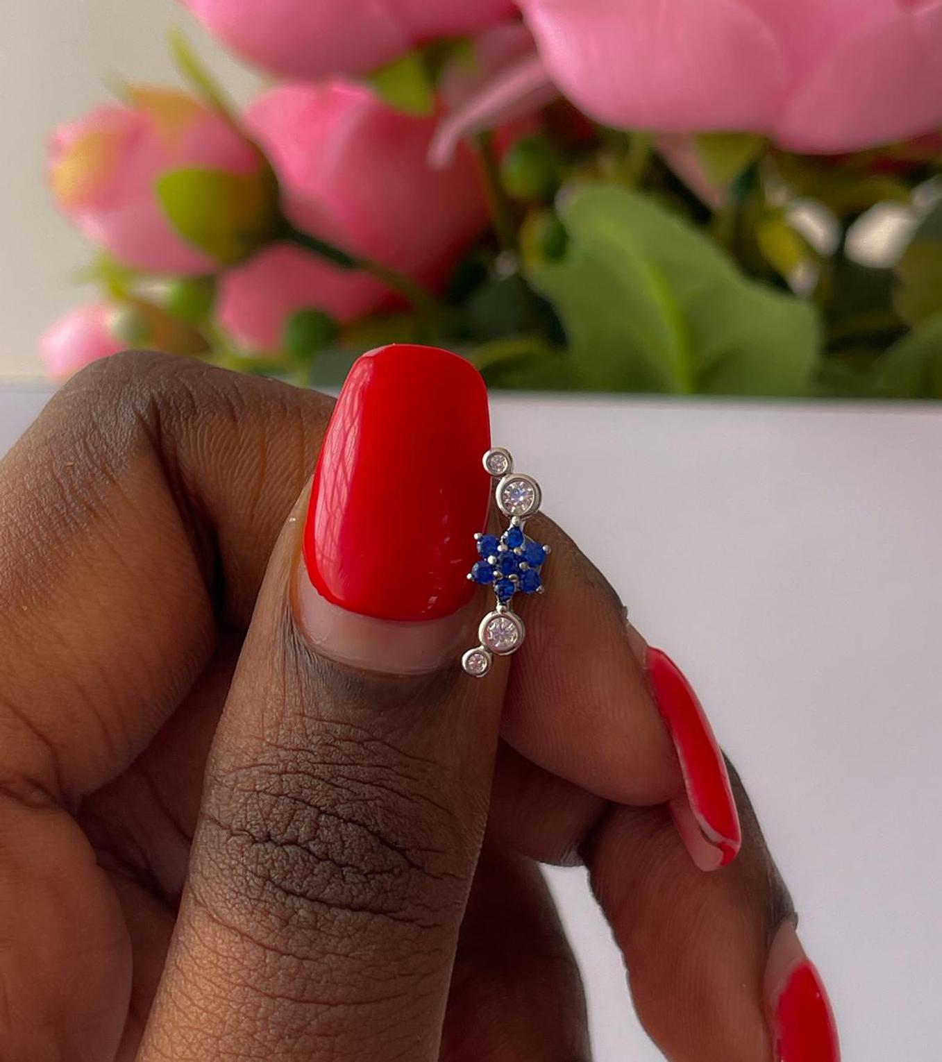 Adorn your ear with the captivating beauty of our Sapphire Blossom & Bead Flat Back Stud, a distinctive addition to any curated ear stack. This high-quality piece of body jewelry is expertly crafted from premium 16G (1.2mm) stainless steel, ensuring exceptional durability, hypoallergenic properties, and resistance to tarnish for enduring wear. The centerpiece features a stunning cluster of vibrant sapphire blue cubic zirconia stones, arranged to form a striking floral design. This is complemented by delicate silver-tone beaded accents, each with a sparkling clear cubic zirconia, creating a dynamic and eye-catching arrangement. This versatile and elegant flower piercing is ideal for various ear piercings, including helix piercings, conch piercings, tragus piercings, and lobe piercings, providing a comfortable and secure fit. The flat back design ensures a smooth profile against the skin, minimizing irritation. Elevate your style with this long-lasting, fashionable, and beautiful stud that seamlessly blends botanical charm with brilliant color and sophisticated sparkle.