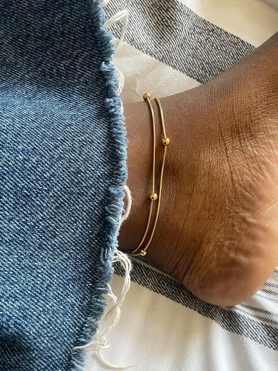This contemporary layered piece features a dual-chain design, pairing a smooth snake chain with a fine strand accented by polished gold orbs. It’s a versatile accessory that offers beautiful texture and fluid movement