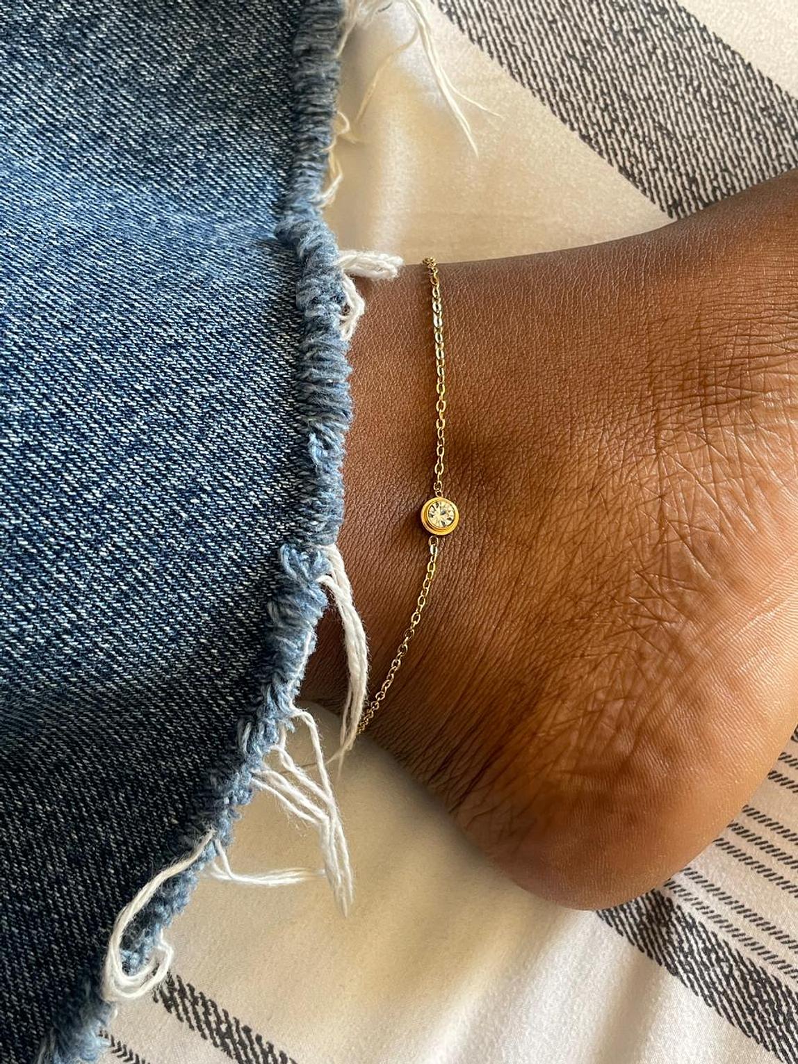 This elegant anklet features a single, captivating bezel-set crystal resting delicately on a fine chain. The minimalist design provides a flash of enduring sparkle and polished sophistication.