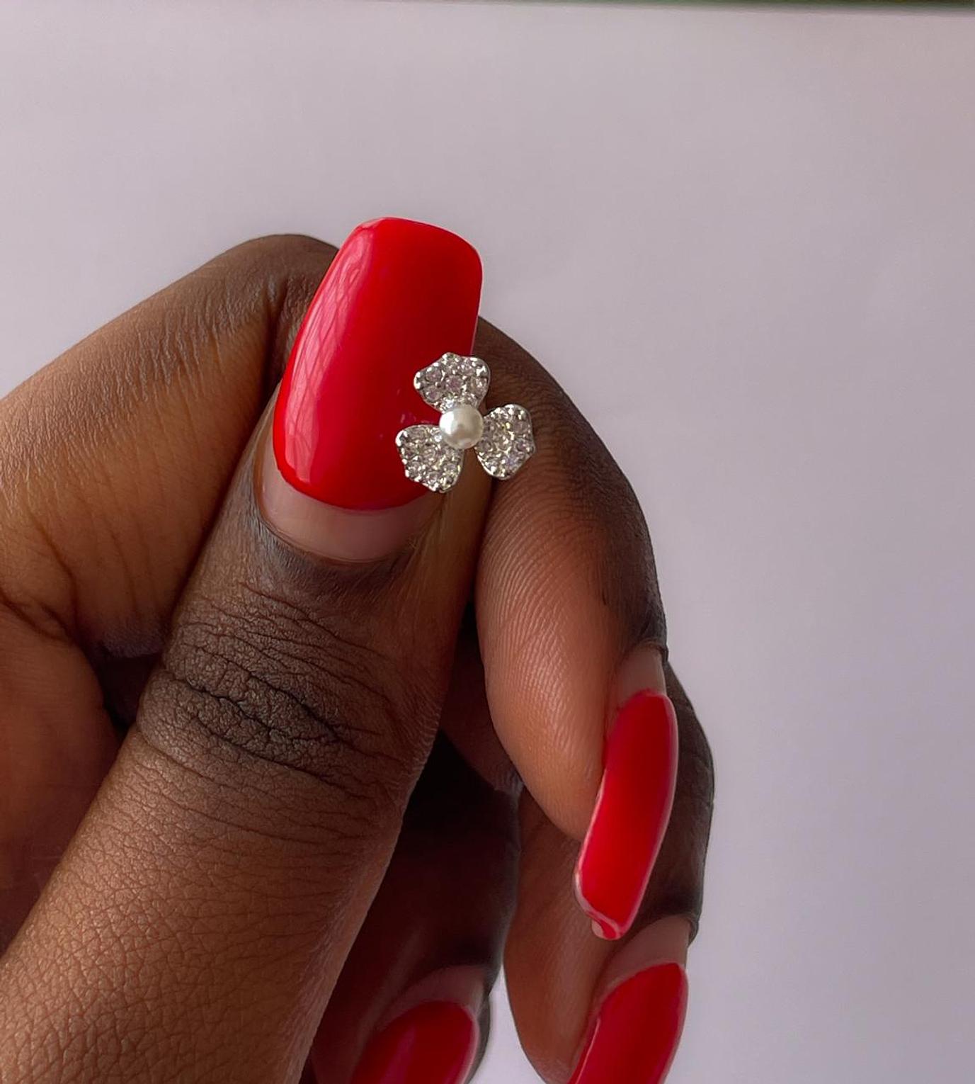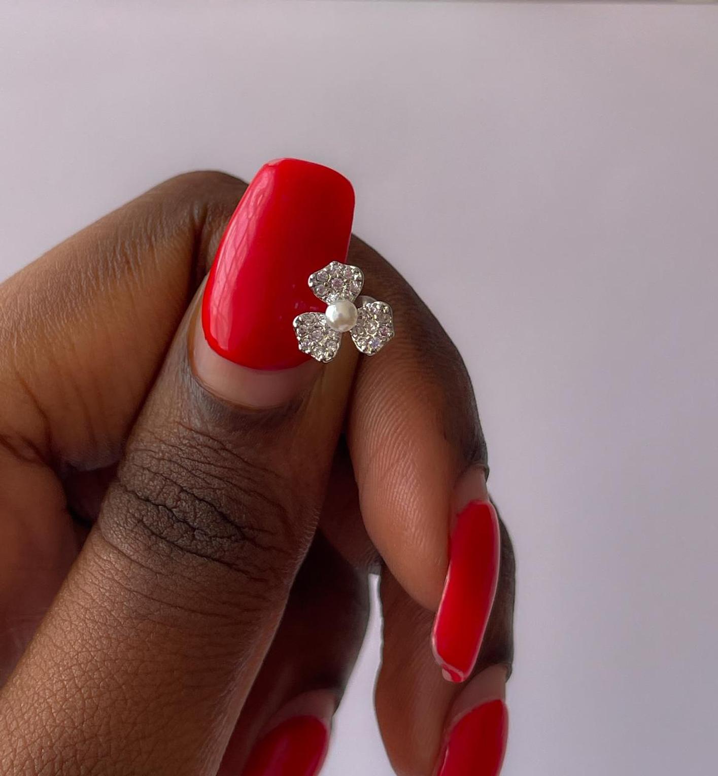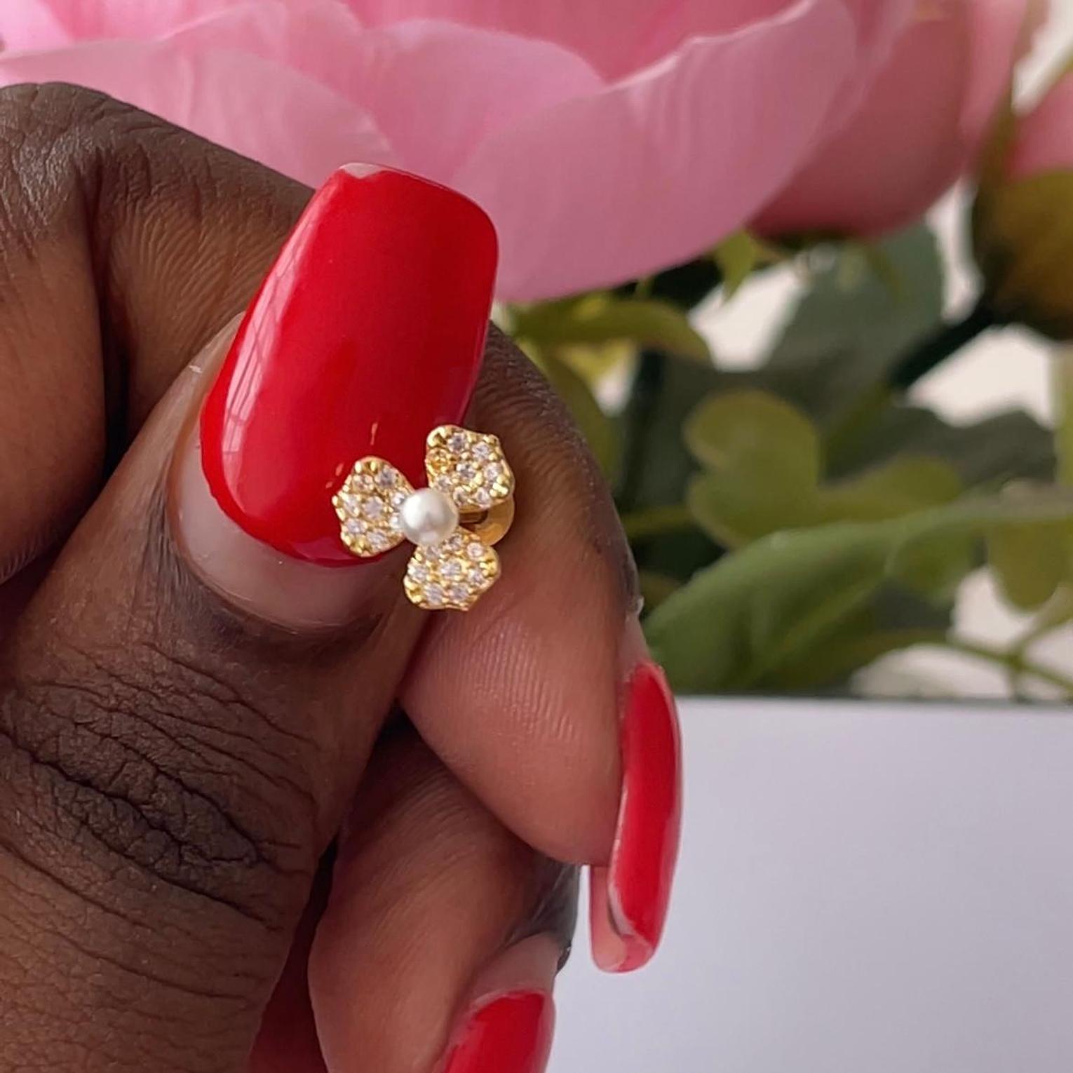 Bloom with elegance wearing our Blossom Pearl Flat Back Stud, a captivating addition to your body jewelry collection. This exquisite piece is meticulously crafted from high-quality 16G (1.2mm) stainless steel, ensuring exceptional durability, hypoallergenic properties, and resistance to tarnish for long-lasting wear. The design features a charming floral motif, with three petals intricately pave-set with shimmering cubic zirconia stones that brilliantly frame a lustrous faux pearl at its center. This delicate yet dazzling flower piercing is ideal for various ear piercings, including helix piercings, conch piercings, tragus piercings, and lobe piercings, offering a secure and comfortable fit. The flat back design provides a smooth profile against the skin, minimizing irritation and maximizing comfort for daily wear. Elevate your ear stack or gift a touch of timeless elegance with this beautiful floral piercing jewelry, a perfect choice for those seeking high-quality, long-lasting, and fashionable accessories that combine natural charm with brilliant sparkle.