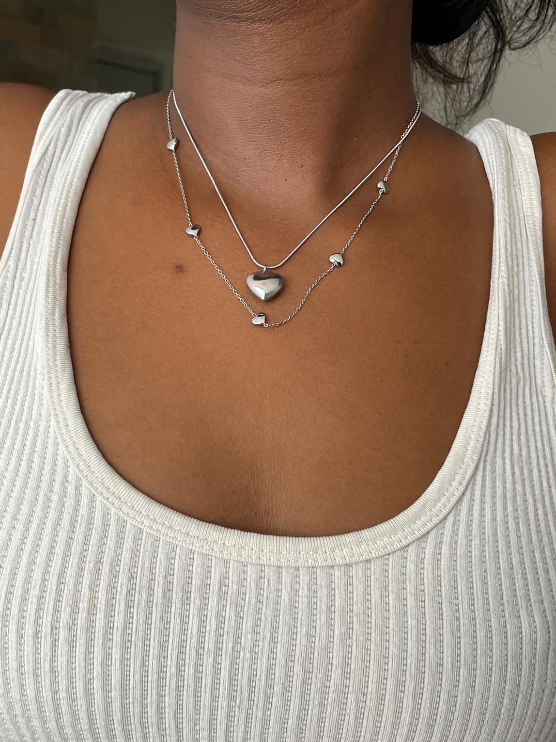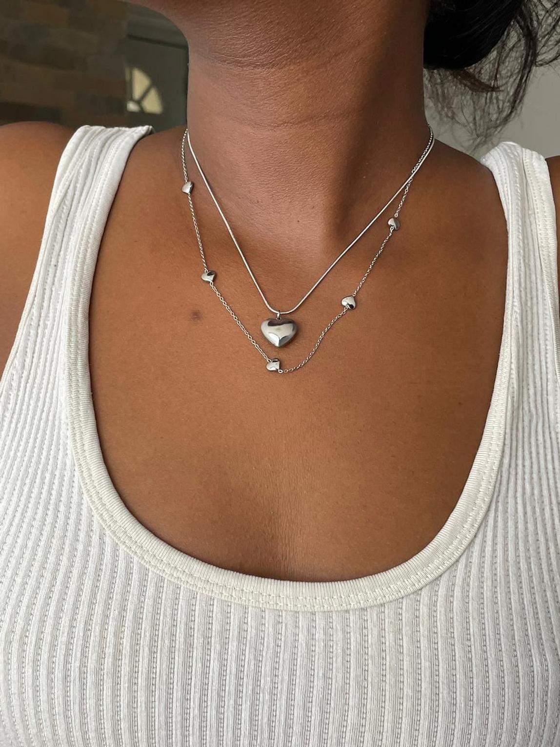 Express your affectionate side with this charming multi-layered silver-toned necklace, featuring a prominent puffy heart pendant and delicate mini heart accents. A romantic and stylish piece perfect for adding a touch of love to your look.