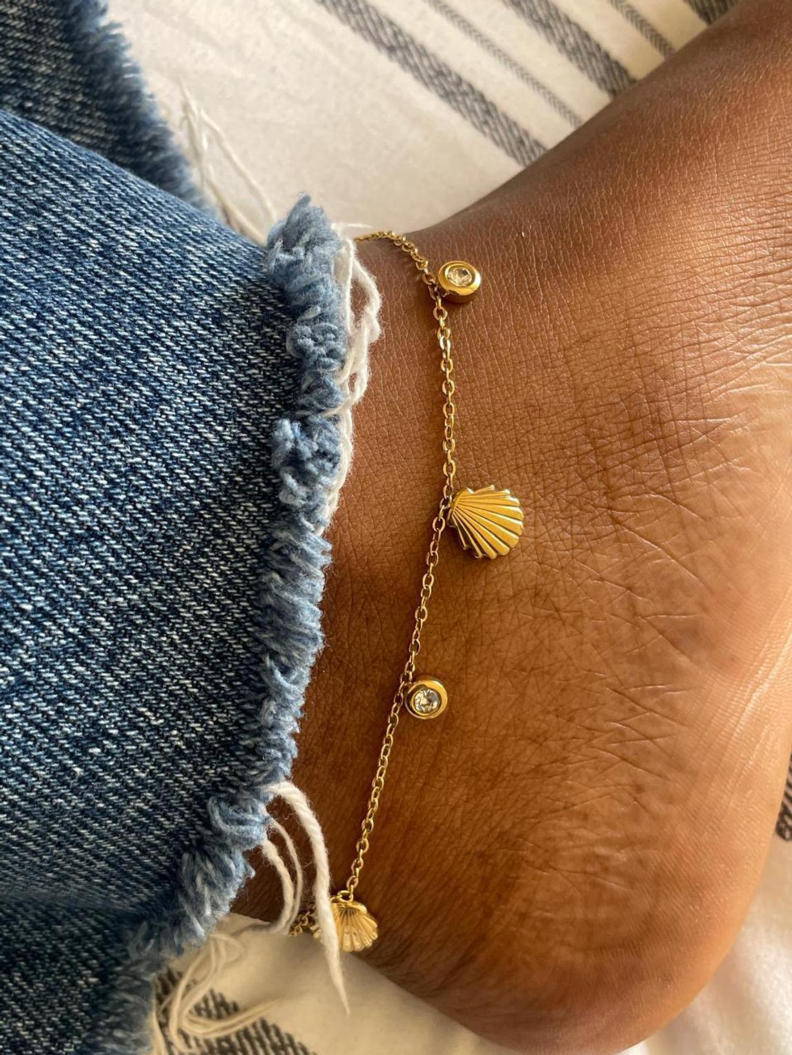Adorn your ankle with the subtle sparkle of the ocean. This delicate chain features charming shell pendants and brilliant crystal accents, perfect for effortless summer elegance.