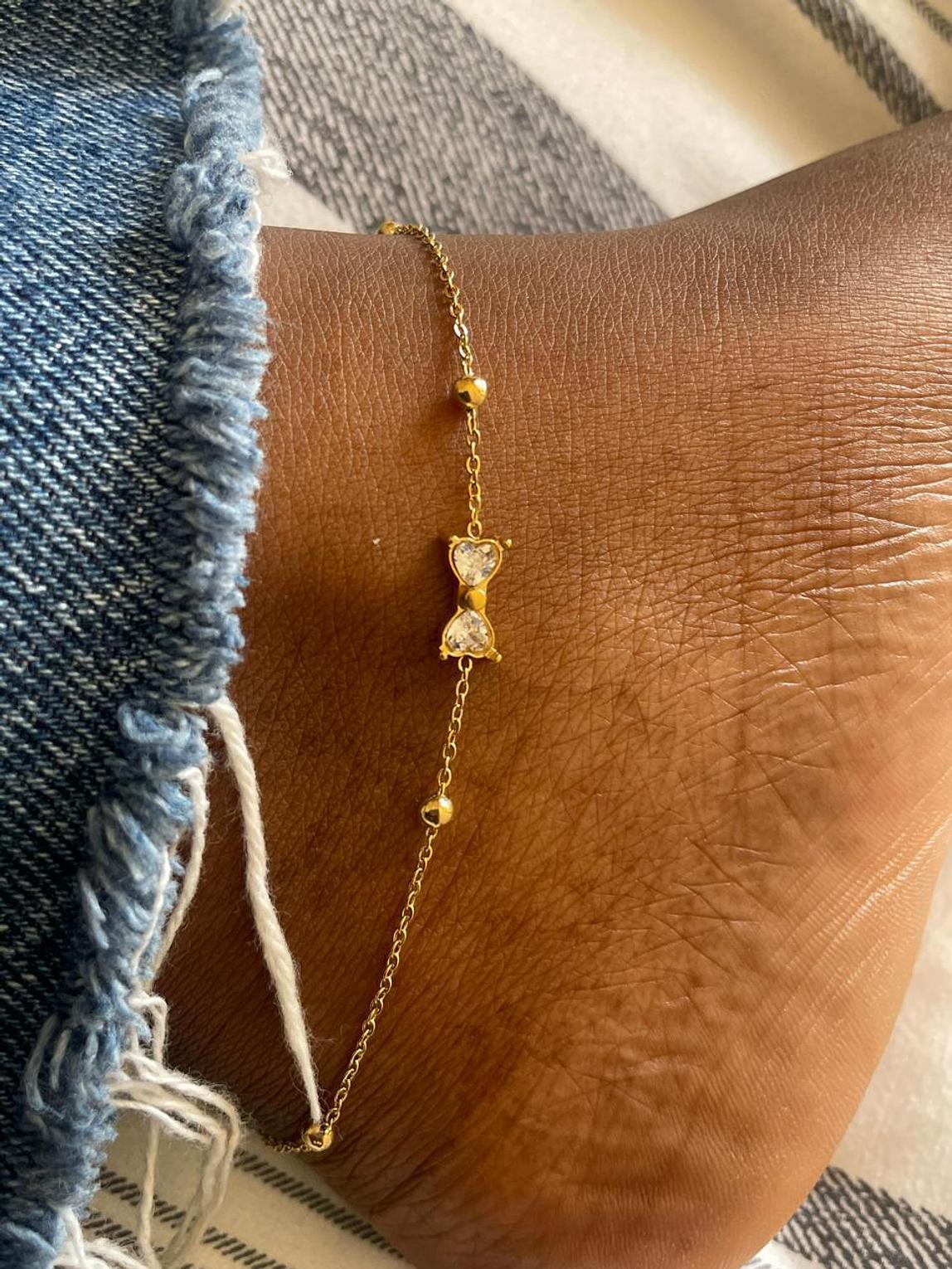 Capture the moment with this delicate anklet featuring a brilliant, hourglass-shaped crystal centerpiece. The slender chain, accented with miniature gold beads, offers a sophisticated and meaningful shine.