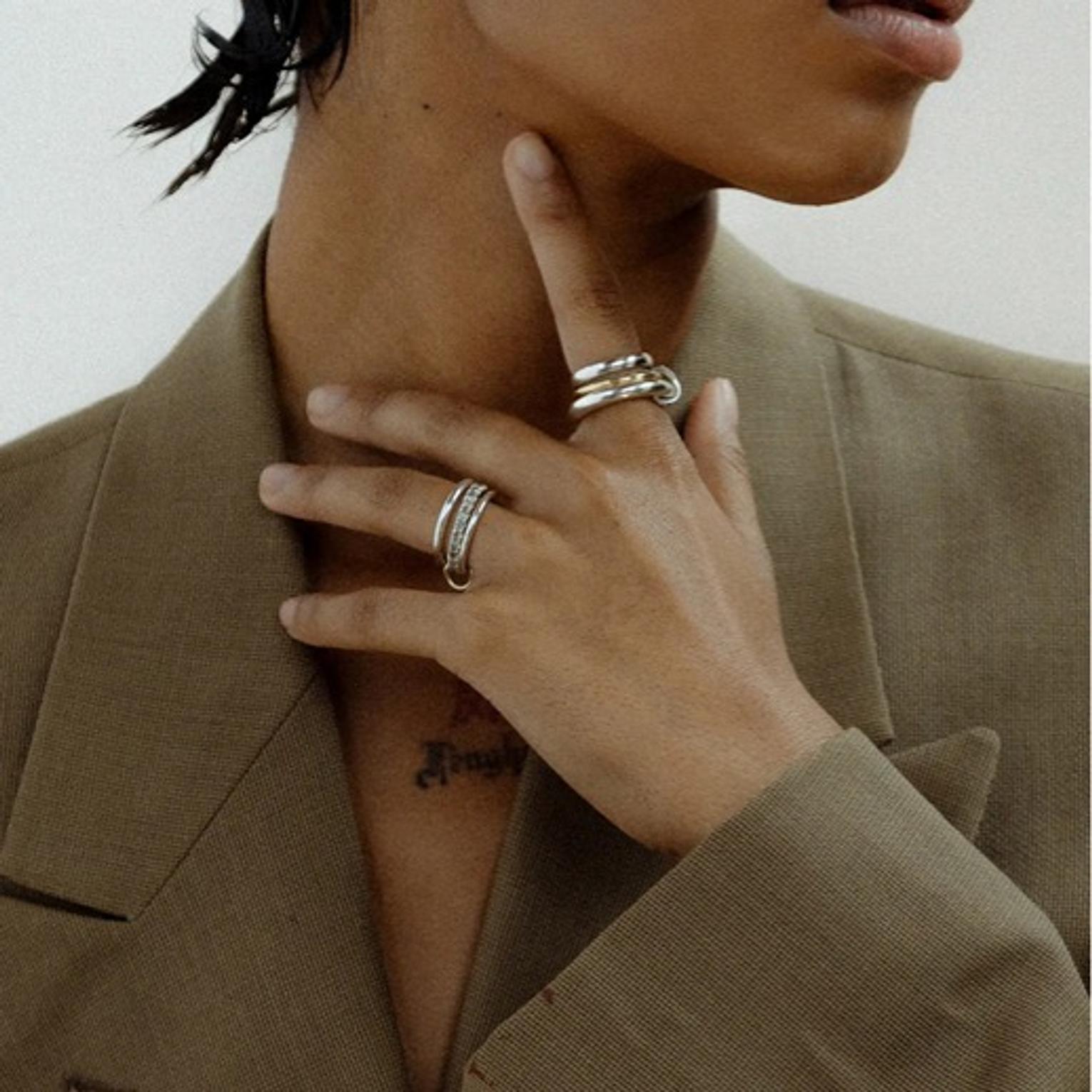 Three interlocked rings in mixed metal tones, symbolizing unity and balance.