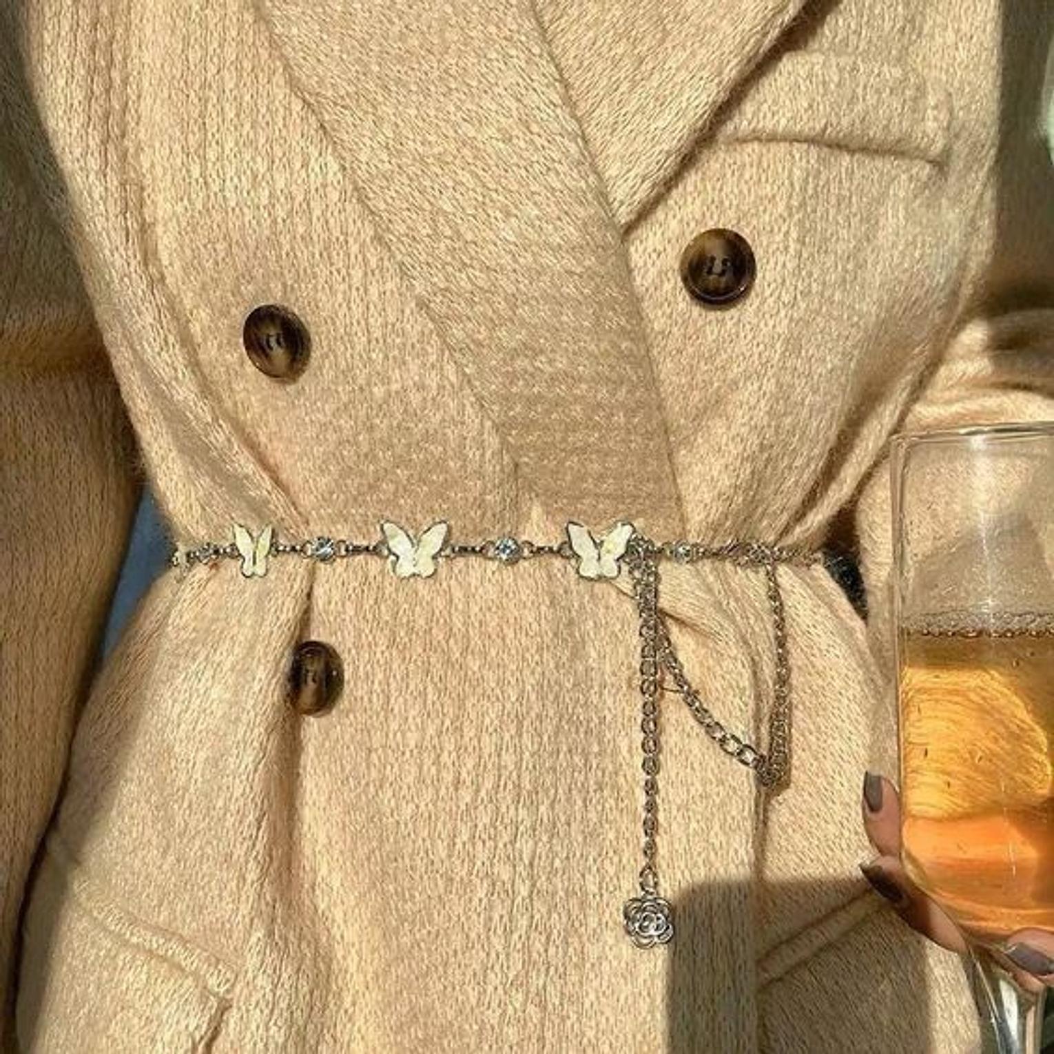 This enchanting vintage butterfly rose chain belt combines romantic femininity with classic sophistication through its beautifully crafted silver-tone design featuring delicate butterfly medallions and an intricate rose pendant detail. Each small butterfly link is meticulously designed with fine wing details that create a continuous pattern of natural beauty, while the decorative hanging chain culminates in an ornate rose charm that adds vintage botanical charm to the overall aesthetic. The adjustable chain construction ensures versatile styling options, allowing wearers to customize the fit for various waist sizes and outfit styles, from cinching oversized blazers to accentuating flowing dresses. This timeless accessory effortlessly bridges the gap between vintage charm and contemporary fashion, making it ideal for those who appreciate romantic jewelry with historical inspiration. The premium silver-tone finish maintains its lustrous appearance through regular wear, ensuring long-lasting beauty and durability for everyday styling. Whether paired with cozy cardigans for casual elegance, layered over vintage-inspired dresses for authentic retro appeal, or used to add feminine detail to modern business attire, this butterfly rose chain belt appeals to fashion enthusiasts who seek unique statement pieces that celebrate nature's beauty. The secure clasp system and quality construction make it suitable for special occasions, romantic dinners, or adding sophisticated charm to everyday outfits for those who appreciate refined vintage-inspired accessoriesÂ