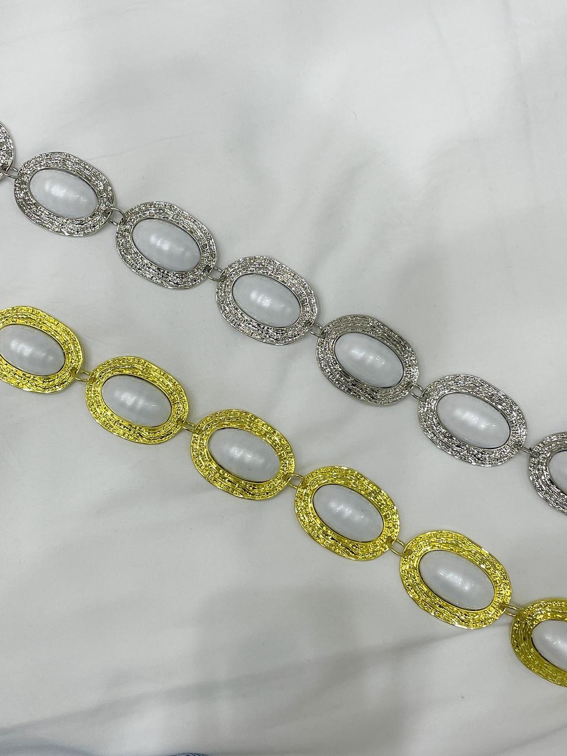 The Vintage Oval Pearl Chain Belt delivers classic elegance with its stunning sequence of luminous oval pearl cabochons, each beautifully framed by intricately textured metallic borders that create depth and visual interest. Available in both luxurious gold-tone and sophisticated silver-tone finishes, this premium waist belt combines the timeless appeal of pearls with contemporary chain design for maximum versatility. Each oval medallion measures approximately 25mm in length and features a smooth, lustrous pearl center that contrasts beautifully with the detailed textured frame, creating an eye-catching interplay of smooth and ornate surfaces. The adjustable chain construction ensures comfortable fit across various waist sizes while providing secure interlocking connections for durability and longevity. Perfect for cinching flowing dresses, blazers, cardigans, or adding sophisticated detail to casual denim outfits, this statement belt appeals to women who appreciate vintage-inspired accessories, pearl jewelry, and versatile pieces that transition effortlessly from office to evening wear. The dual color options allow for seamless coordination with both warm and cool-toned wardrobes, making it an essential accessory for the modern woman's collection.